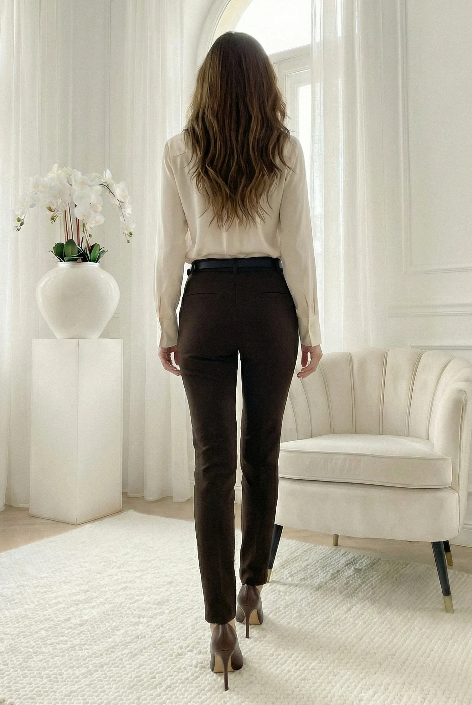 Pantaloni maro cu curea, o alegere sofisticata oferind o silueta bine definita si un confort sporit pe parcursul intregii zile. Designul clasic este completat de talia inalta si curea, fiind piesa ideala pentru a fi asortata cu o camasa eleganta. Compozi