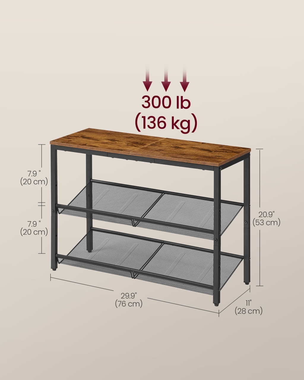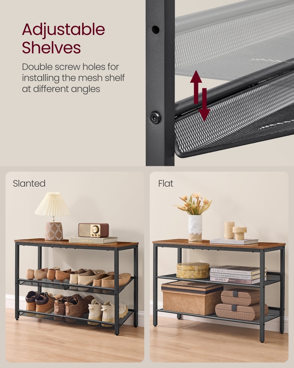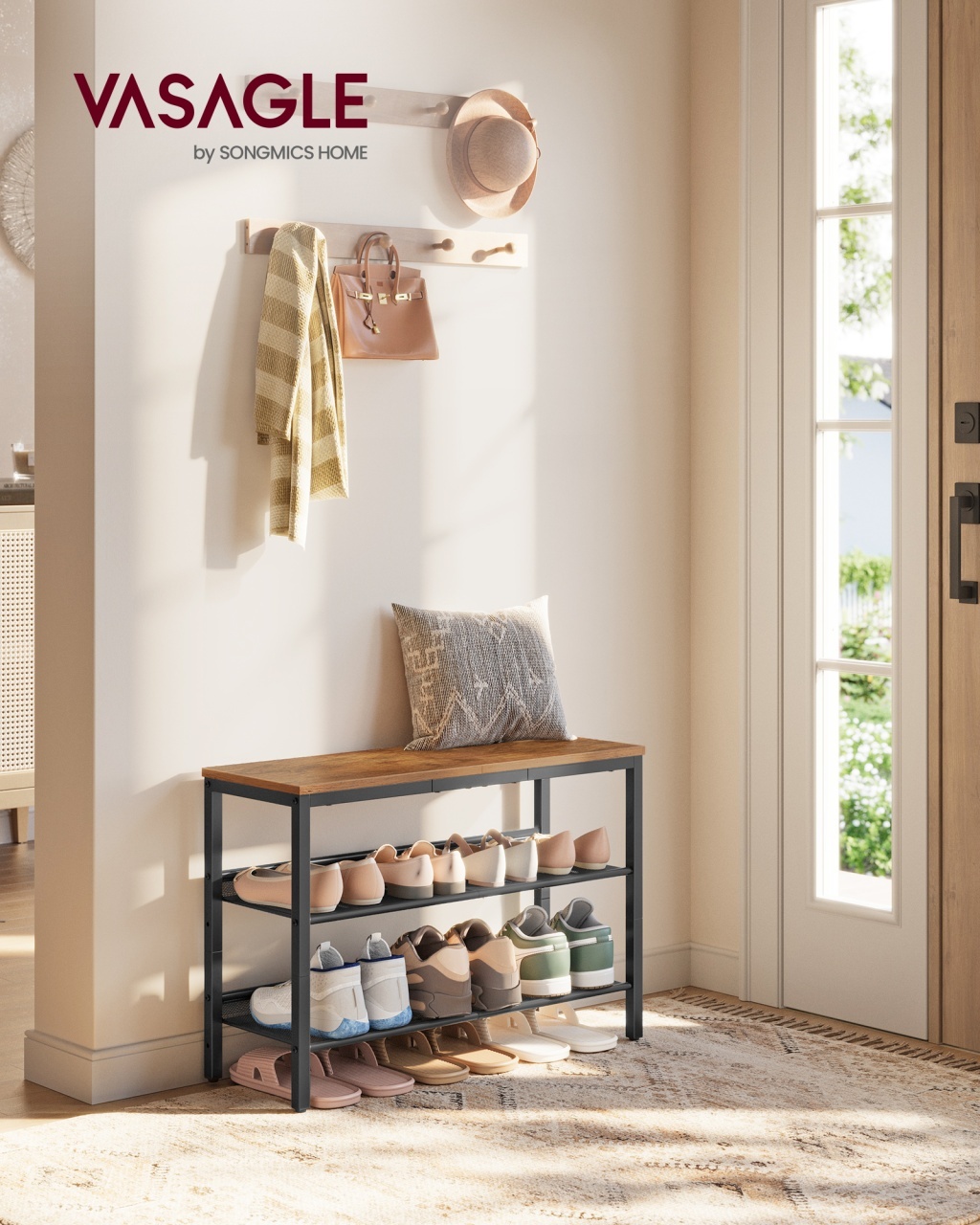 Pantofar Vasagle Maro 28x75x53 cm - Organizare Stilată și Robustă Design modern și materiale de calitate Acest pantofar îmbină perfect estetica rustică a PAL-ului melaminat cu finisajul maro vintage și structura solidă din metal vopsit în negru. Designul său industrial aduce un plus de stil în orice hol, transformând o piesă utilitară într-un element de decor atractiv. Calitatea materialelor asigură o durabilitate extinsă, cadrul metalic oferind stabilitatea necesară pentru utilizarea zilnică intensă. Funcționalitate și organizare Cu o capacitate de stocare pentru 6-9 perechi de pantofi, acest organizator este extrem de versatil. Cele două polițe din plasă metalică sunt ajustabile, putând fi montate drept sau înclinat pentru a acomoda diverse tipuri de încălțăminte, de la teniși la botine sau pantofi cu toc. Blatul superior este extrem de rezistent, suportând o sarcină de până la 136 kg, ideal pentru a așeza genți sau cutii de depozitare, în timp ce marginea posterioară ridicată protejează peretele de murdărie. Montaj și întreținere Produsul se livrează demontat, însă asamblarea este rapidă datorită pieselor numerotate și a instrucțiunilor clare. Pachetul include un kit anti-răsturnare pentru siguranță sporită, fixând raftul ferm de perete. Suprafața din PAL și metal se curăță ușor cu o cârpă umedă, menținând aspectul impecabil fără efort. Picioarele sunt reglabile pentru a compensa micile denivelări ale podelei. Comandă acum Comandă acum pentru a transforma Holul cu stil și eficiență! Detalii tehnice complete Dimensiuni și greutate Dimensiuni produs: 75 x 28 x 53 cm Greutate produs: 5.5 kg Materiale și caracteristici Material cadru/corp: Metal / PAL melaminat Culoare: Maro rustic / Negru Sarcina maximă blat: 136 kg Sarcina maximă poliță: 11 kg Montaj și pachet Stare asamblare: Neasamblat Conținut pachet: 1 x Pantofar, accesorii montaj, kit anti-răsturnare, schiță Stil și origine Stil: Industrial / Rustic Destinație recomandată: Hol Comandă acum Adaugă în coș și organizează-ți încălțămintea cu eleganță!