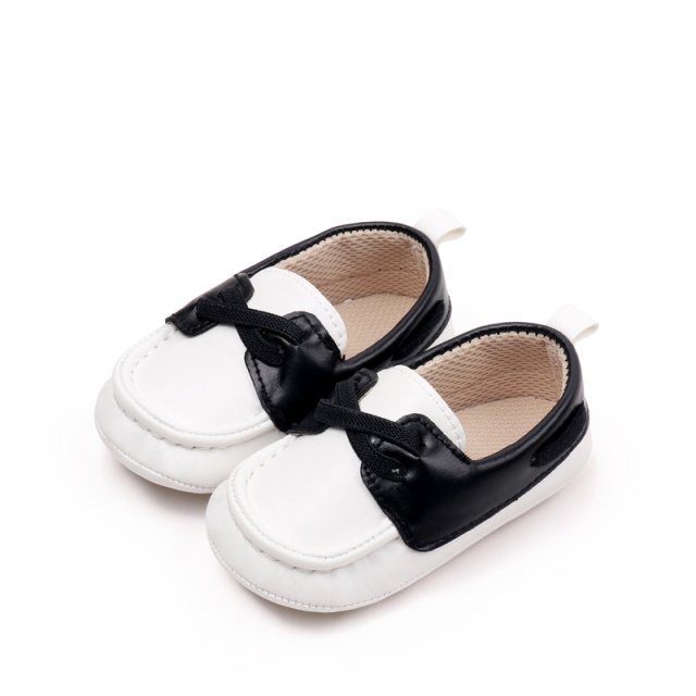 Marimi: 3-6 luni (lungimea talpitei: la interior - 10,5 cm; la exterior - 11 cm) 6-9 luni (lungimea talpitei: la interior - 11,5 cm; la exterior - 12 cm) 9-12 luni (lungimea talpitei: la interior - 12,5 cm; la exterior - 13 cm) Pantofiori tip mocasini pentru baietei, din material tip piele ecologica. Culoare: alb cu negru Talpa: piele ecologica cu insertie de cauciuc antiderapant