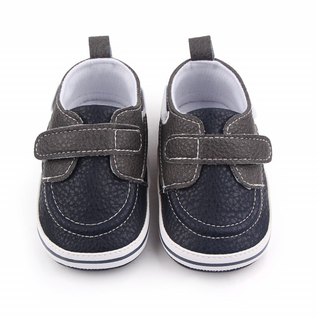 Marimi: 3-6 luni (lungimea talpitei: la interior - 10,5 cm; la exterior - 11 cm) 6-9 luni (lungimea talpitei: la interior - 11,5 cm; la exterior - 12 cm) 9-12 luni (lungimea talpitei: la interior - 12,5 cm; la exterior - 13 cm) Pantofiori tip mocasini pentru baietei, din material tip piele ecologica, se inchid cu bareta cu arici intr-o parte. Culoare: negru cu gri petrol Talpa: material tip piele ecologica