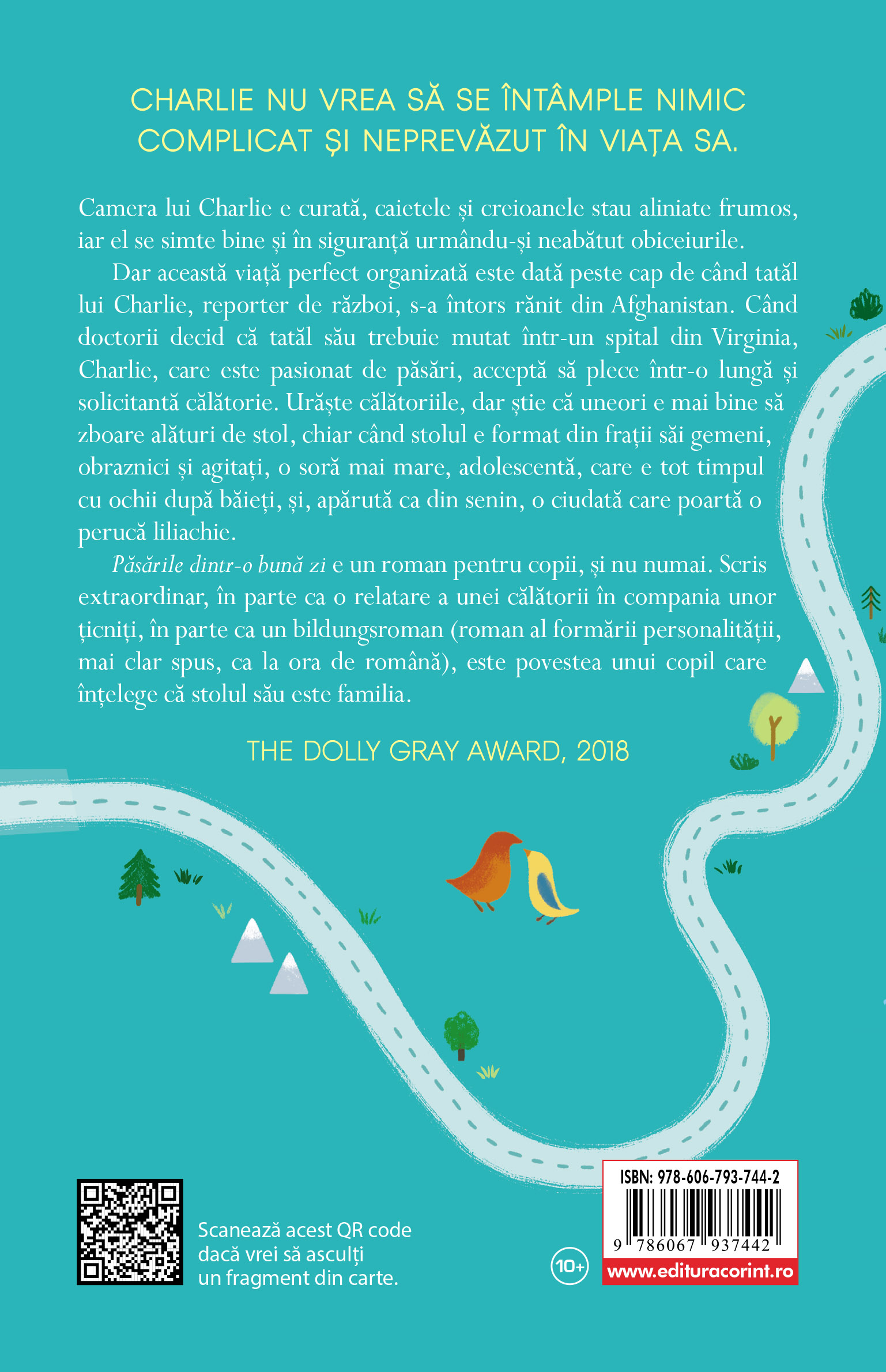 #html-body [data-pb-style=I32D1FQ]{justify-content:flex-start;display:flex;flex-direction:column;background-position:left top;background-size:cover;background-repeat:no-repeat;background-attachment:scroll}Charlie nu vrea să se întâmple nimic complicat și neprevăzut în viața sa. nCamera lui Charlie e curată, caietele și creioanele stau aliniate frumos, iar el se simte bine și în siguranță urmându-și neabătut obiceiurile. Dar această viață perfect organizată este dată peste cap de când tatăl lui Charlie, reporter de război, s-a întors rănit din Afghanistan. Când doctorii decid că tatăl său trebuie mutat într-un spital din Virginia, Charlie, care este pasionat de păsări, acceptă să plece într-o lungă și solicitantă călătorie. Urăște călătoriile, dar știe că uneori e mai bine să zboare alături de stol, chiar dacă stolul e format din frații săi gemeni, obraznici și agitați, o soră mai mare, adolescentă, care e tot timpul cu ochii după băieți, și, apărută ca din senin, o ciudată care poartă o perucă liliachie. „Oferindu-ne un amestec de suspans, mister, dramatism și umor, cartea lui Sally J. Pla surprinde și semnificația propriu-zisă, și pe cea simbolică a unei călătorii.” nPublishers Weekly n„O încântare, de la început până la sfârșit.”nBooklist n„Pla ne propune un erou memorabil în această carte deopotrivă lirică și amuzantă.” nShelf Awareness n„O poveste despre o călătorie, autentică și amuzantă, care ne arată că până și o persoană fără simțăminte poate fi uneori răvășită de un miracol.”nBookPage.com