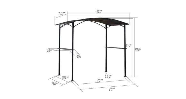 Specificatii: Gazebo pentru gratar de 2,5x1,5 m cu copertina de culoare neagra, rezistenta la intemperii Cadru din otel negru acoperit cu pulbere, rezistent la rugina Rafturi integrate, pentru prepararea și servirea alimentelor Asamblare usoara sau posibilitate de service experimentat pentru orice intrebari Lungime: 244 cm Latime: 152 cm Inaltime: 218 cm Greutate: 21 kg Rezistenta la vant (km/h): 20 Material: otel/poliester Tip acoperis: Copertina Acoperire cadru: Acoperire cu pulbere Culoare cadru: Negru Culoare copertina: Negru Lungime ambalaj: 209 cm Latime ambalaj: 43 cm Inaltime ambalaj: 12 cm Greutate ambalaj: 23 Kg