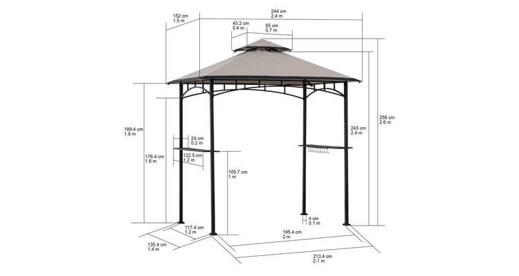 Specificatii: Gazebo pentru gratar de 2,5x1,5 m cu copertina in nuante variate de gri, crem, bej sau rosu Cadru din otel negru acoperit cu pulbere, rezistent la rugina Copertina cu 2 niveluri pentru ventilatie Asamblare usoara sau posibilitate de service experimentat pentru orice intrebari Lungime: 244 cm Latime: 152 cm Inaltime: 258 cm Greutate: 19 kg Rezistenta la vant (km/h): 20 Material: otel/poliester Tip acoperis: Softtop Acoperire cadru: Acoperire cu pulbere Culoare cadru: Negru Culoare copertina: Maro/Bej Lungime ambalaj: 208 cm Latime ambalaj: 28 cm Inaltime ambalaj: 19,5 cm Greutate ambalaj: 24 Kg