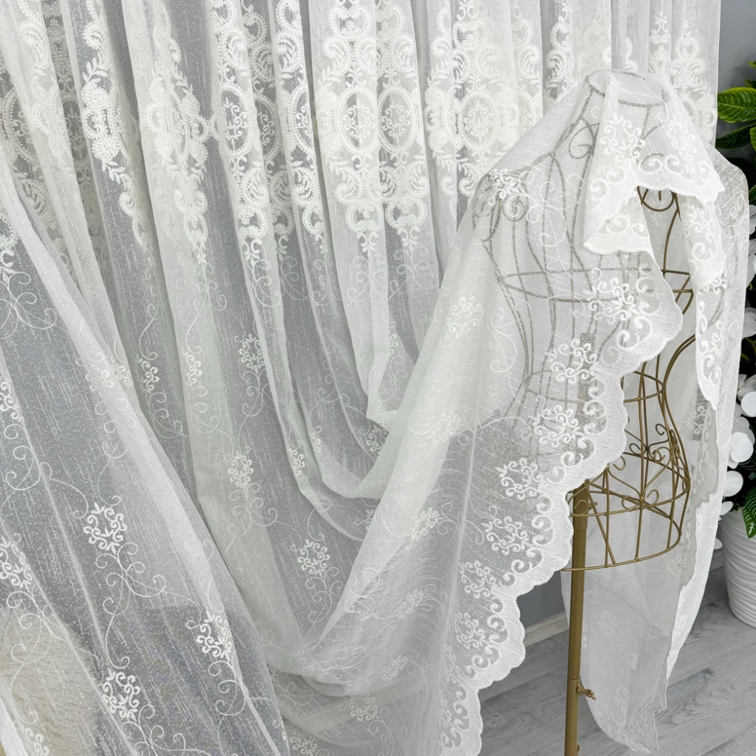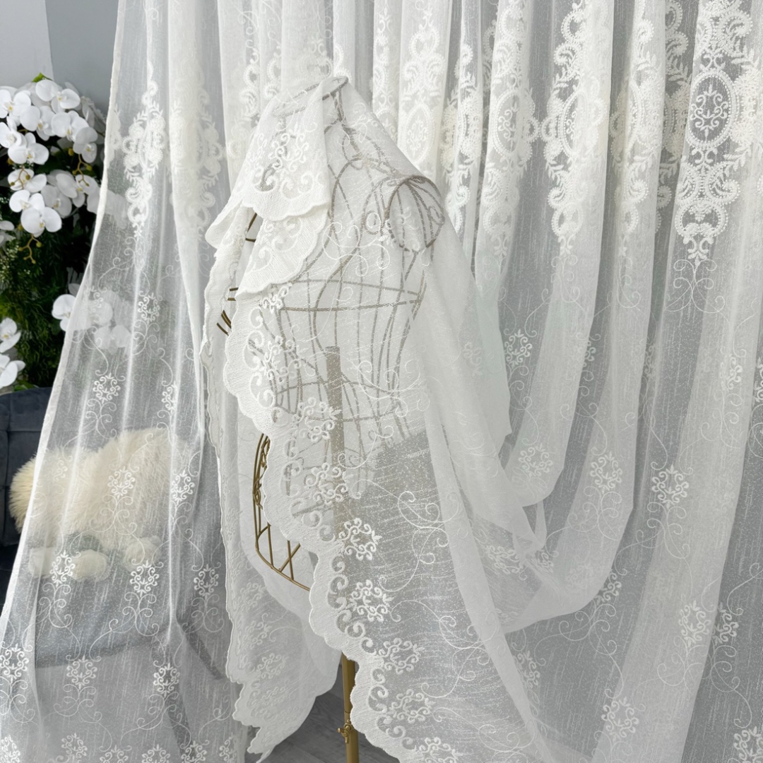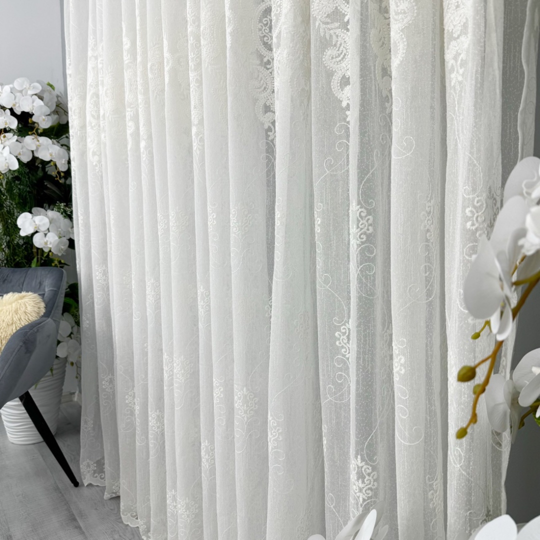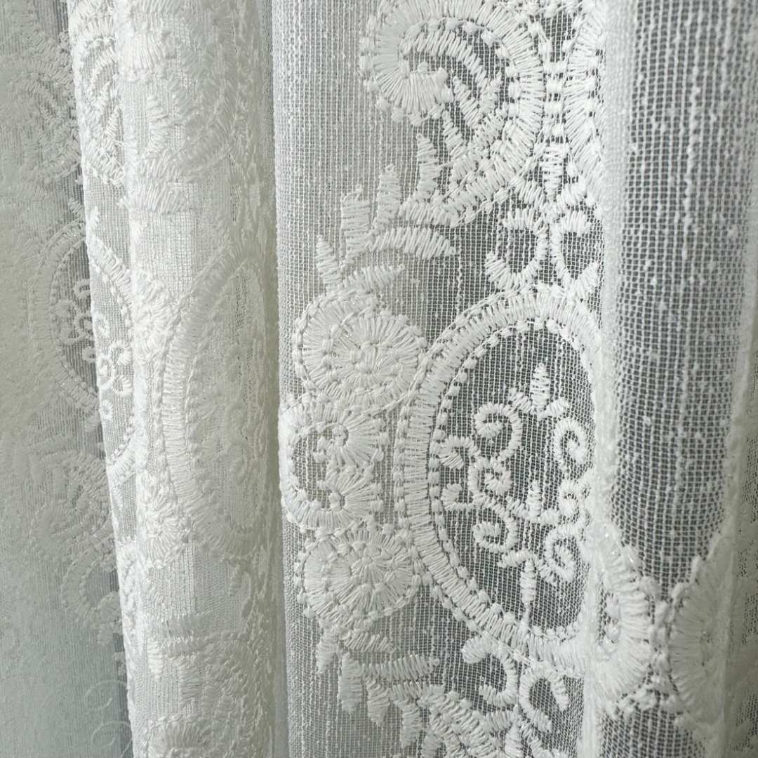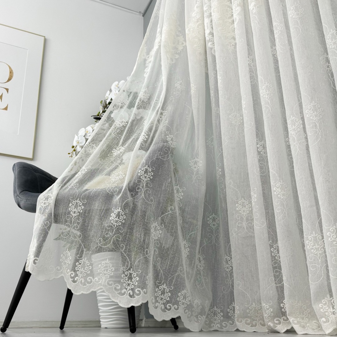 Perdea tip in brodat, dimensiune standard, cu rejansa pt bara. COMPOZITIA MATERIALULUI:  100% poliester CONTINUTUL PACHETULUI: perdea, pe dimensiune standard - 1 bucata 140x260cm.INTRETINEREA PRODUSULUI: Se spala la max. 30°C si se calca la temperatura normala, cu abur. Nu se recomanda spalarea cu inalbitori chimici si nici uscarea prin centrifugare. Inainte de prima utilizare, recomandam spalarea draperiilor, pentru a elimina eventualele impuritati si urme de praf. SISTEM DE PRINDERE: