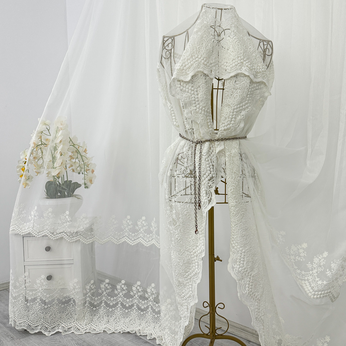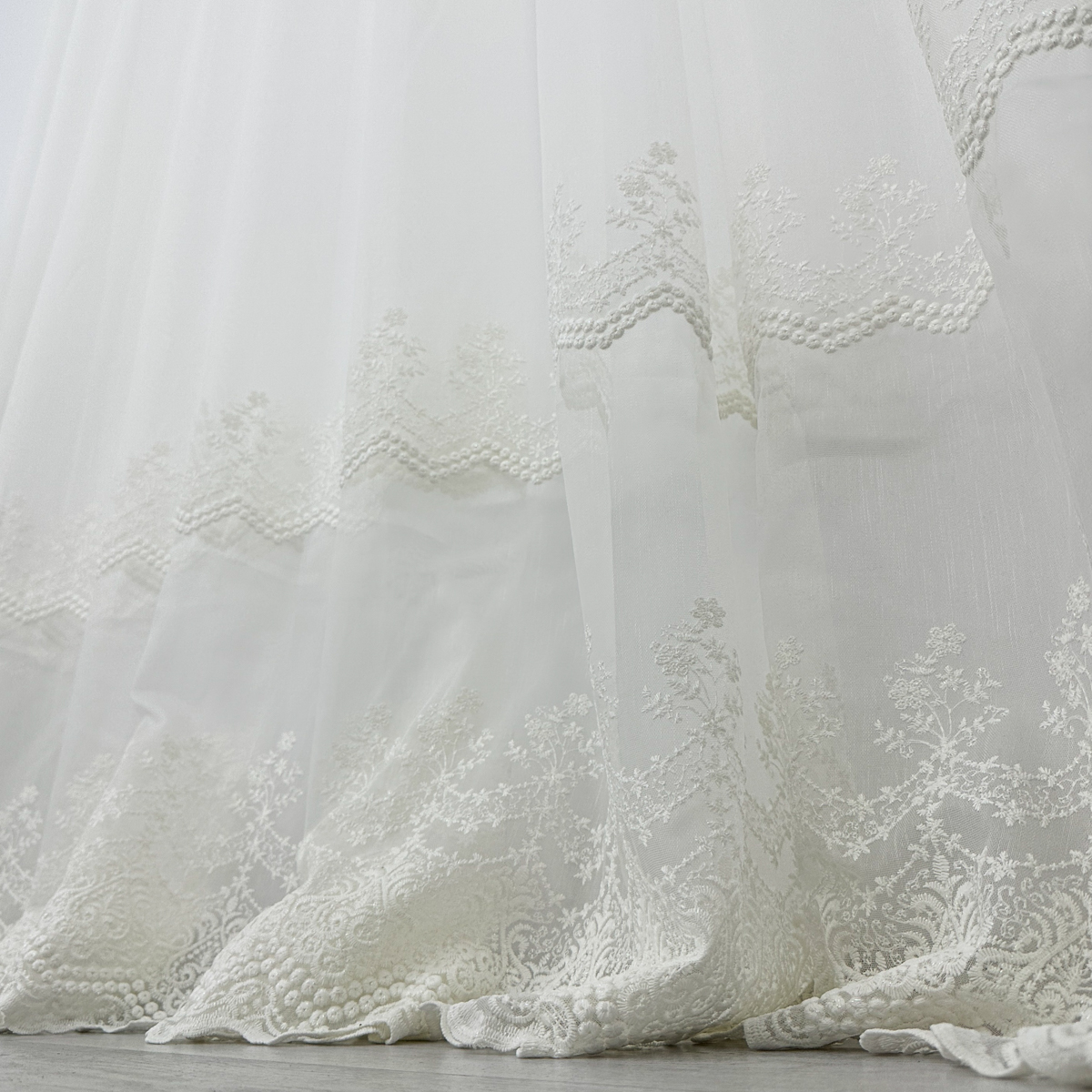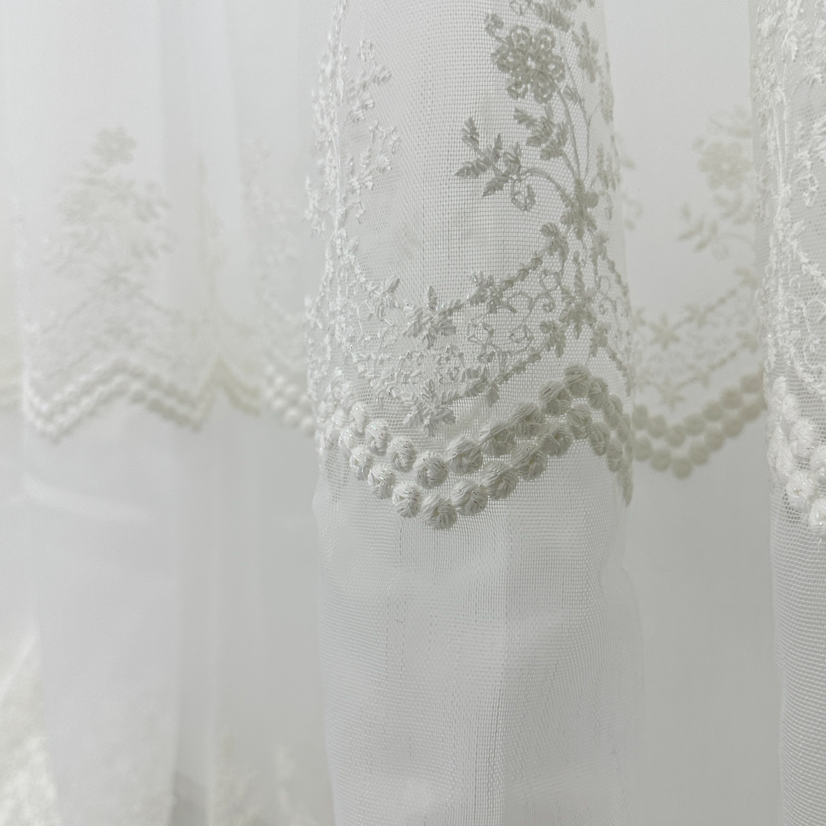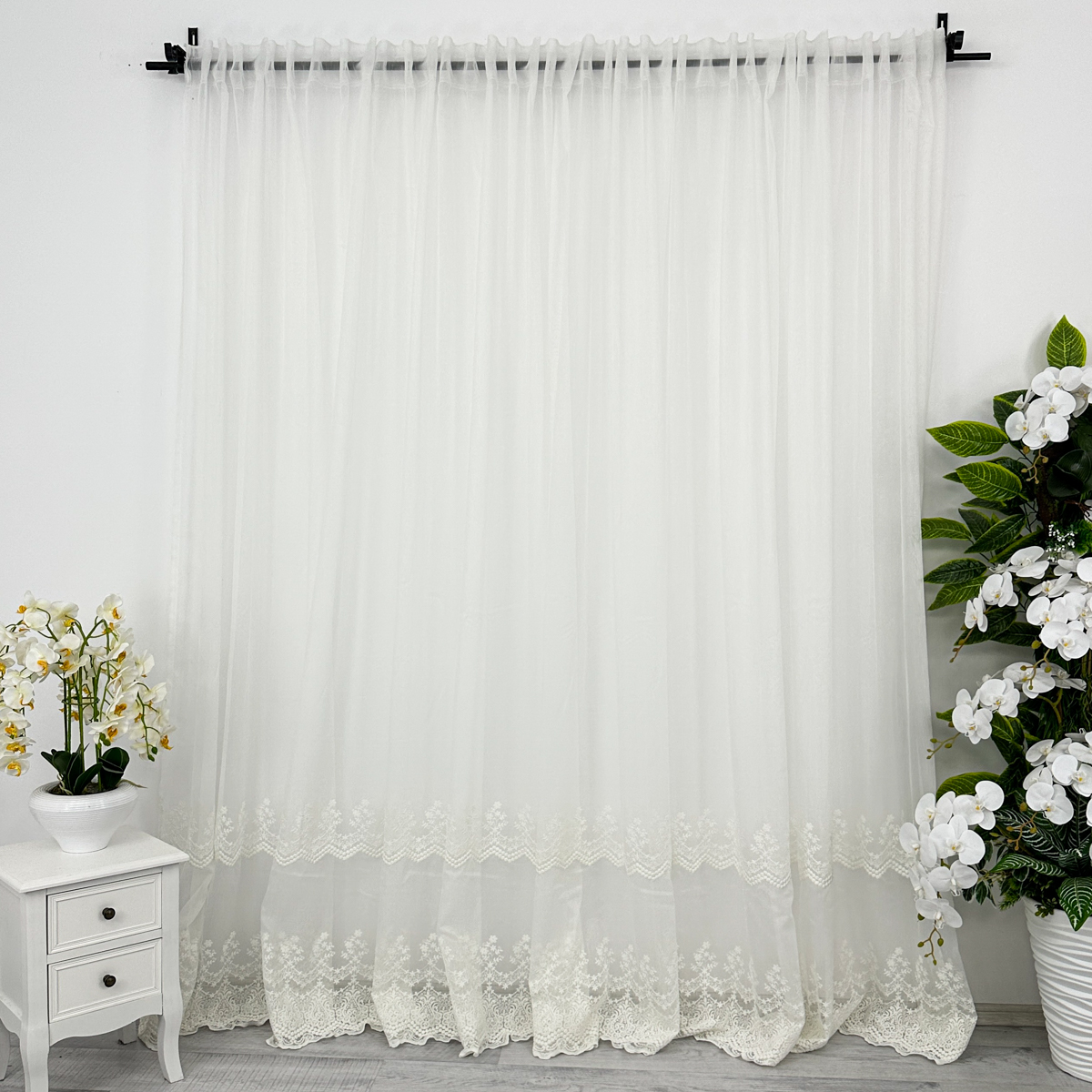 Perdea din tulle cu broderie, dimensiune standard, cu rejansa pt bara. COMPOZITIA MATERIALULUI:  100% poliester CONTINUTUL PACHETULUI: perdea, pe dimensiune standard - 1 bucata 140x260cm.INTRETINEREA PRODUSULUI: Se spala la max. 30°C si se calca la temperatura normala, cu abur. Nu se recomanda spalarea cu inalbitori chimici si nici uscarea prin centrifugare. Inainte de prima utilizare, recomandam spalarea draperiilor, pentru a elimina eventualele impuritati si urme de praf. SISTEM DE P