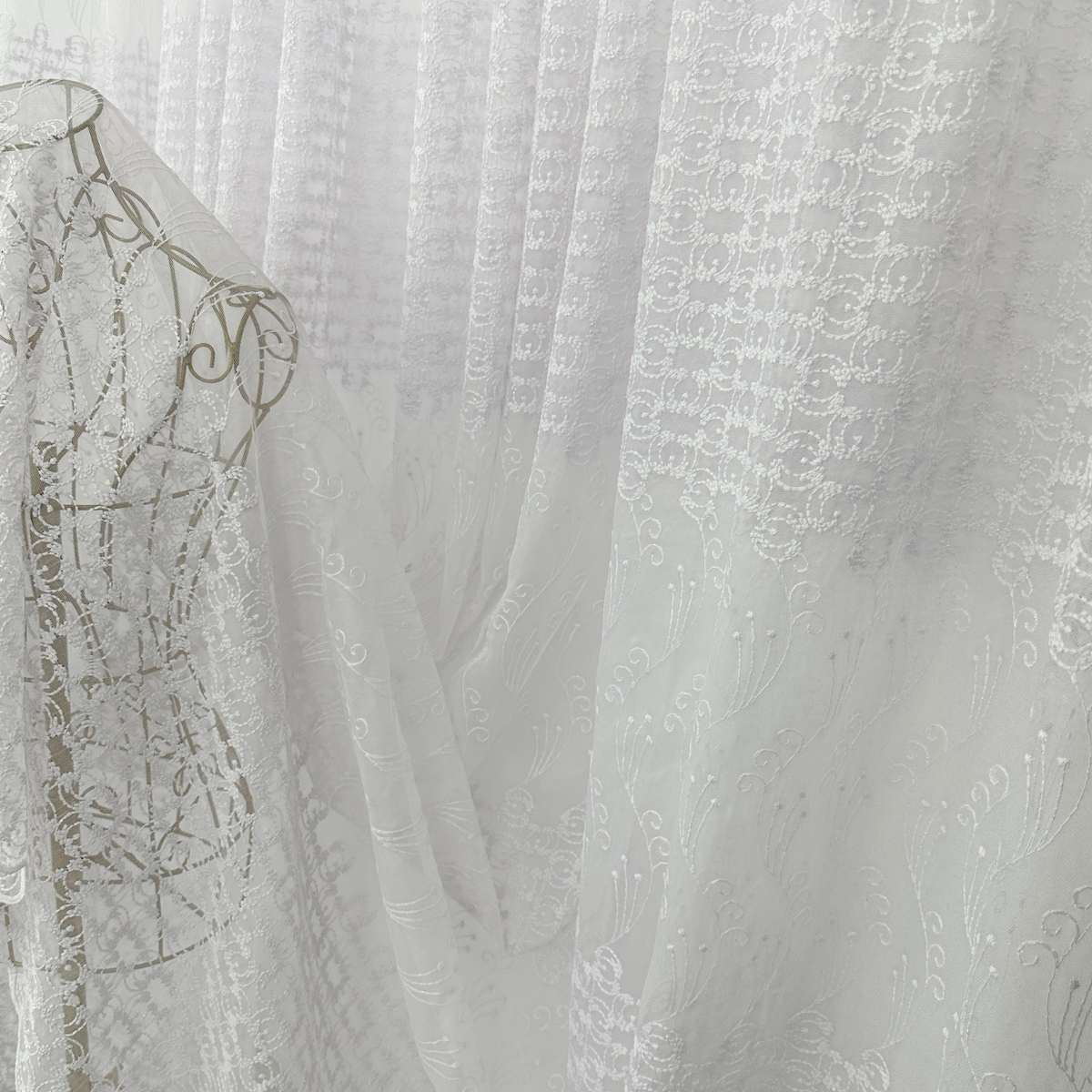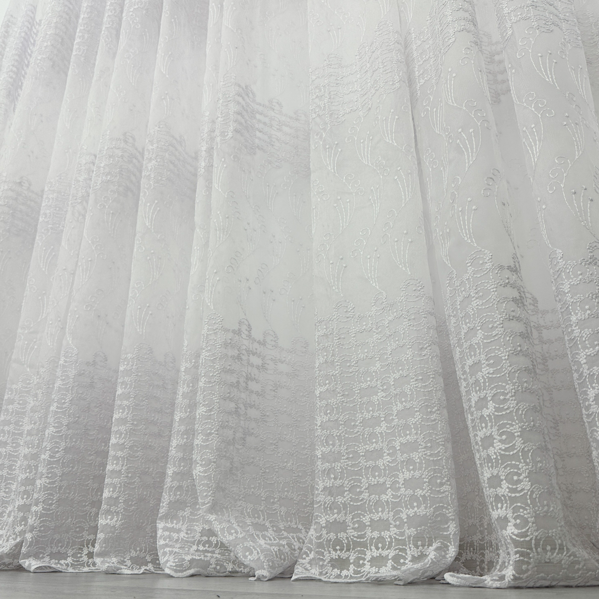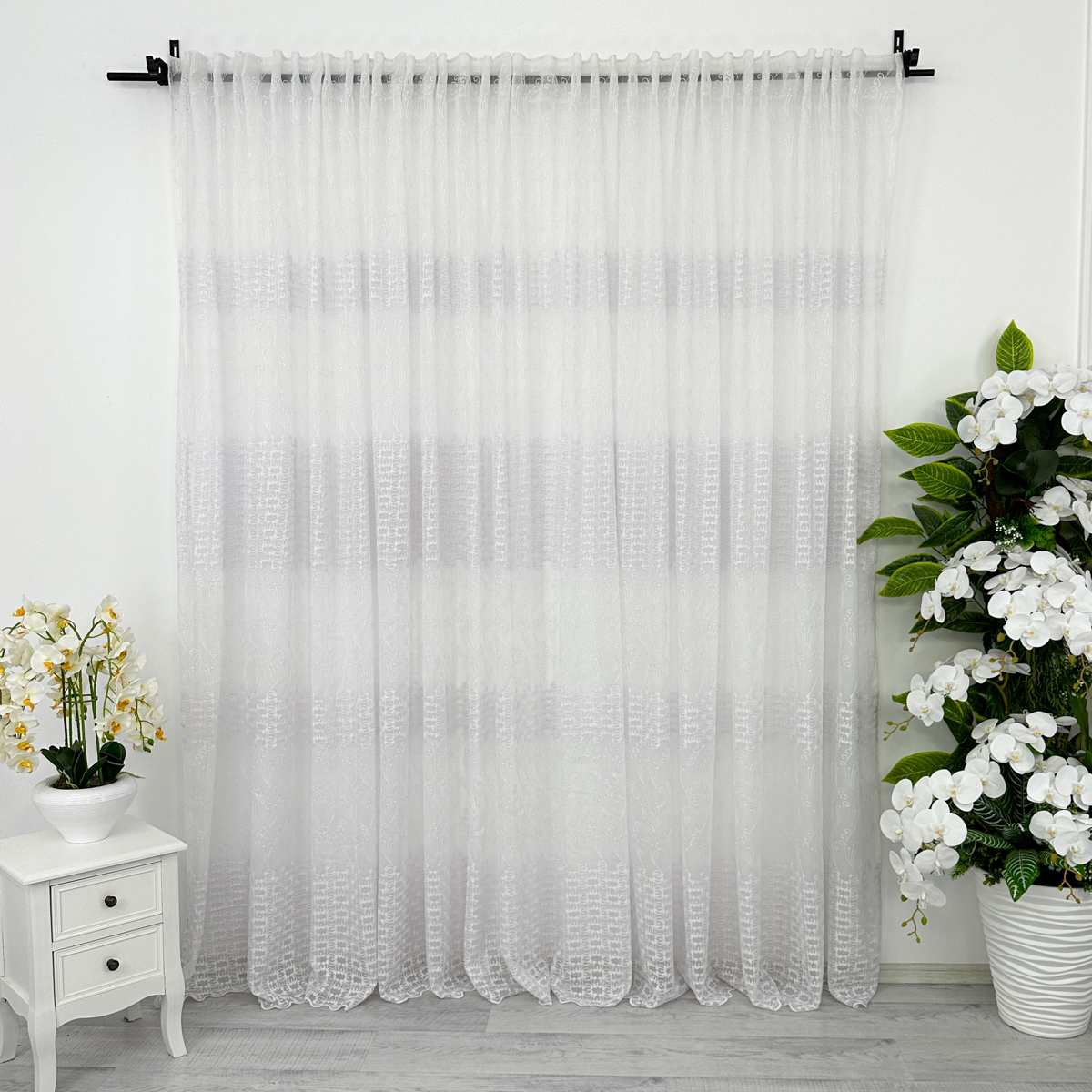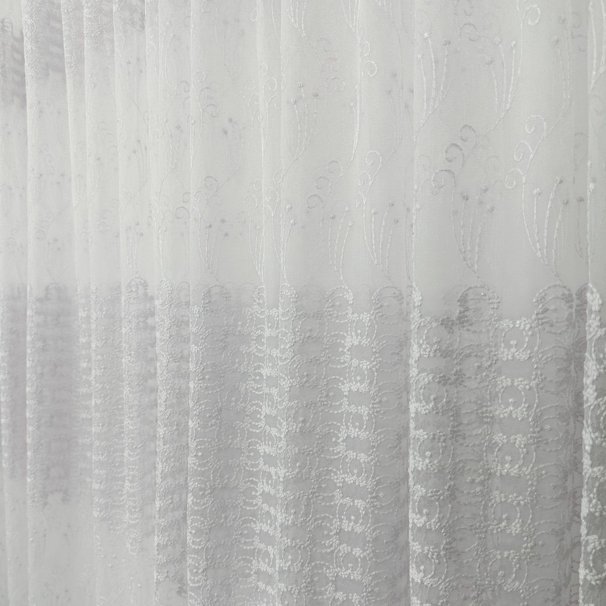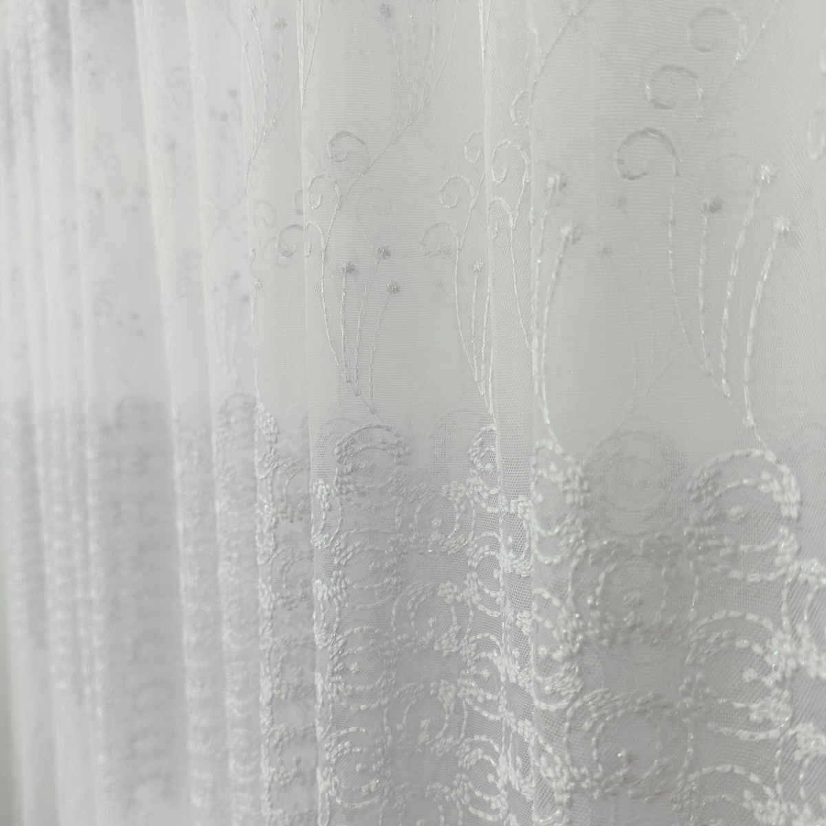 Perdea din tulle cu broderie, dimensiune standard, cu rejansa pt bara. COMPOZITIA MATERIALULUI:  100% poliester CONTINUTUL PACHETULUI: perdea, pe dimensiune standard - 1 bucata 140x260cm.INTRETINEREA PRODUSULUI: Se spala la max. 30°C si se calca la temperatura normala, cu abur. Nu se recomanda spalarea cu inalbitori chimici si nici uscarea prin centrifugare. Inainte de prima utilizare, recomandam spalarea draperiilor, pentru a elimina eventualele impuritati si urme de praf. SISTEM DE P