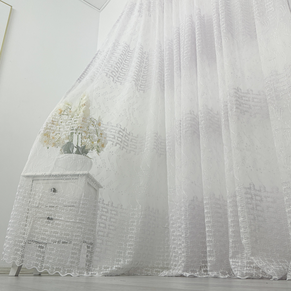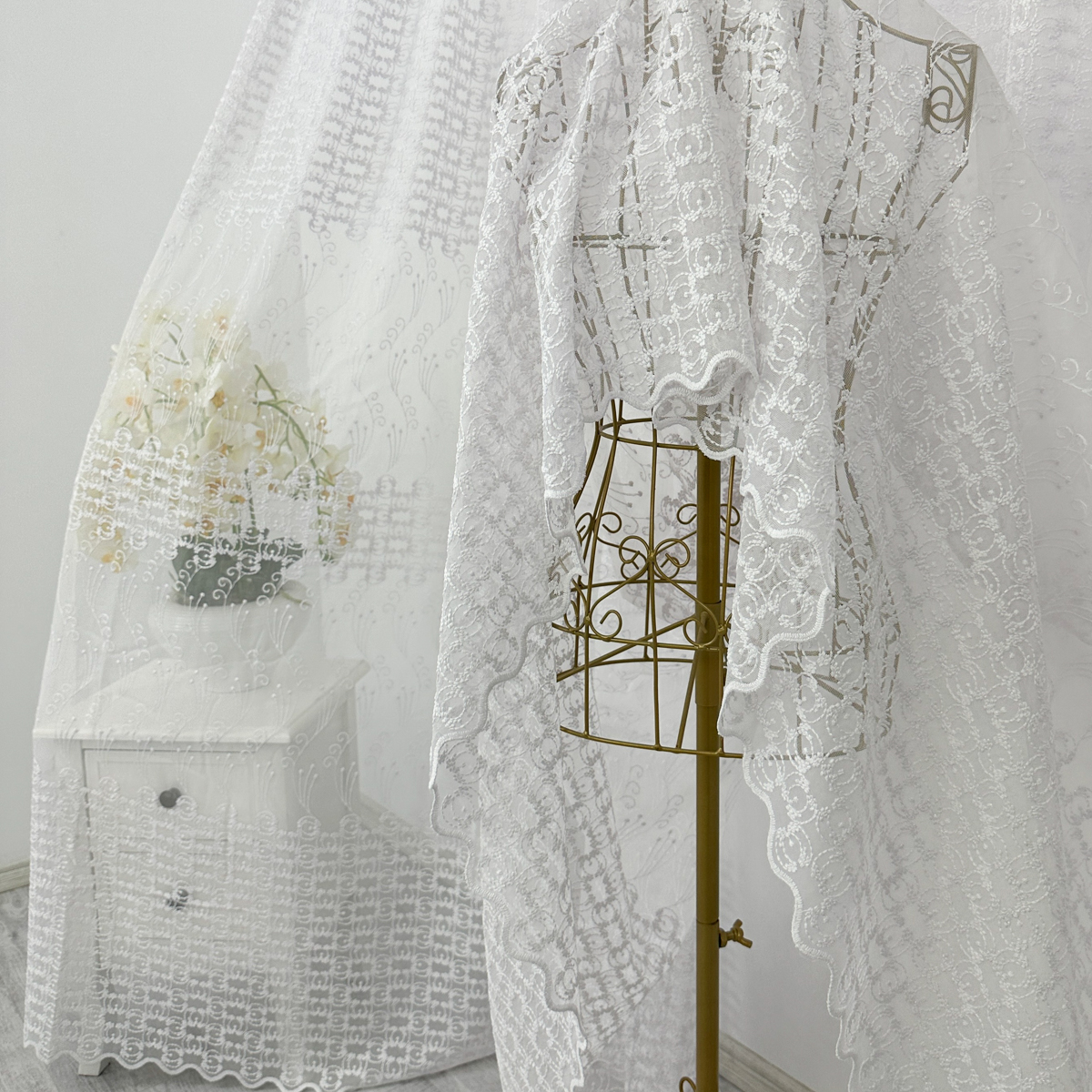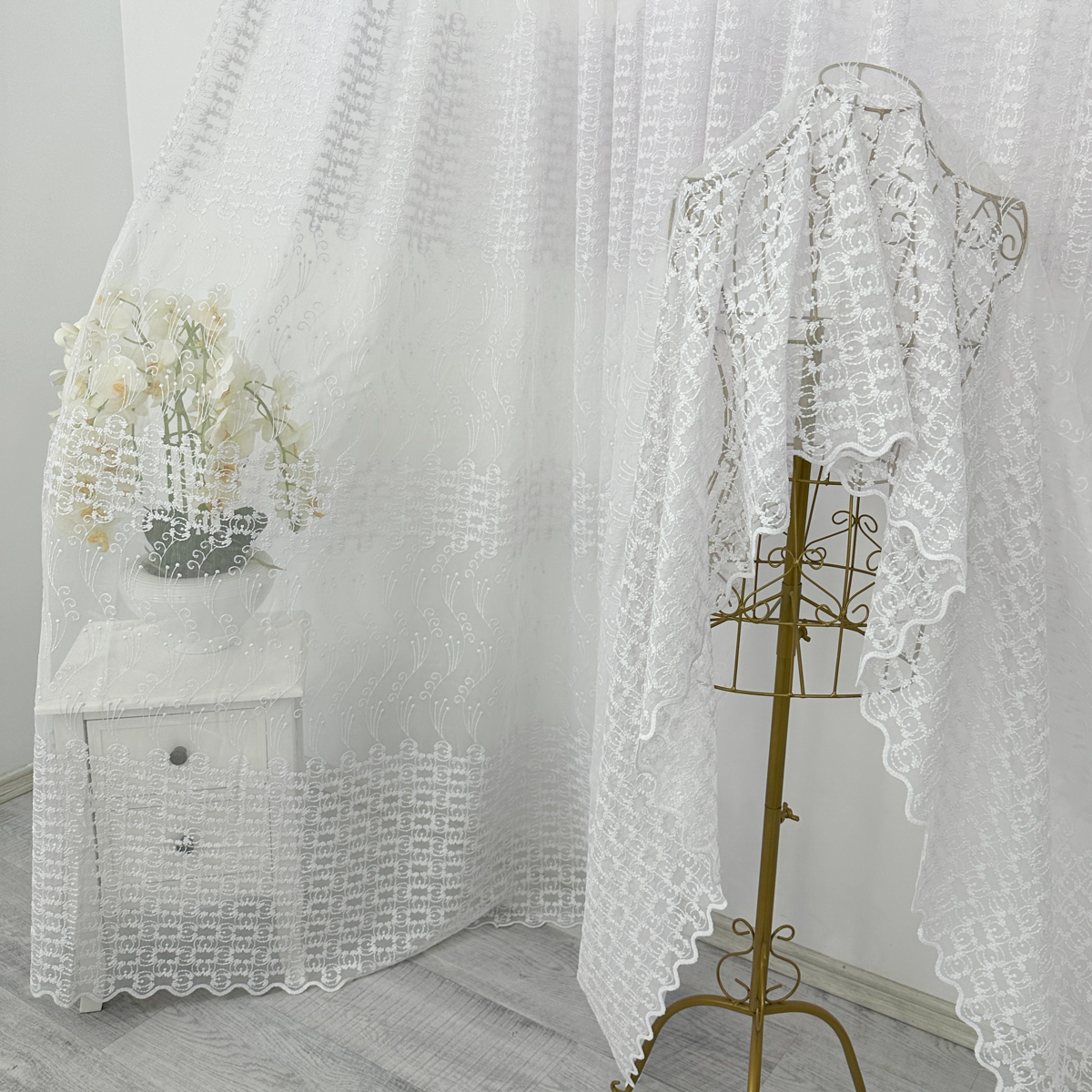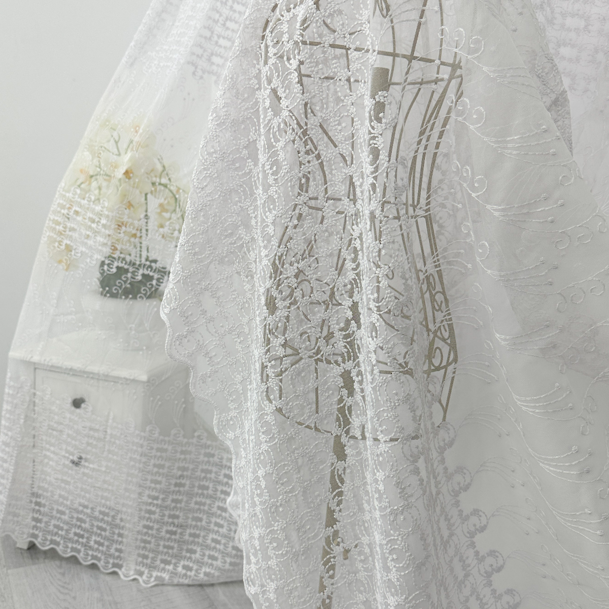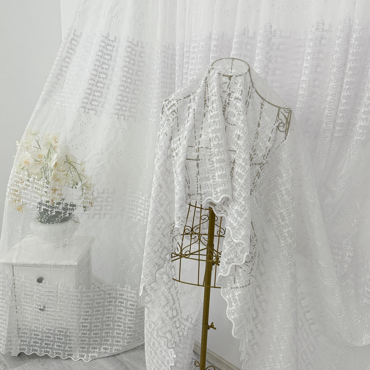 Perdea din tulle cu broderie, dimensiune standard, cu rejansa pt bara. COMPOZITIA MATERIALULUI:  100% poliester CONTINUTUL PACHETULUI: perdea, pe dimensiune standard - 1 bucata 140x260cm.INTRETINEREA PRODUSULUI: Se spala la max. 30°C si se calca la temperatura normala, cu abur. Nu se recomanda spalarea cu inalbitori chimici si nici uscarea prin centrifugare. Inainte de prima utilizare, recomandam spalarea draperiilor, pentru a elimina eventualele impuritati si urme de praf. SISTEM DE P