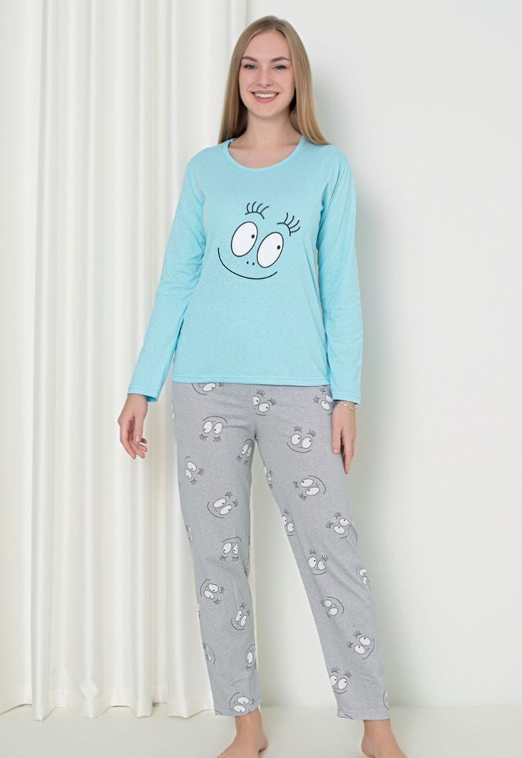 Pijama damă cu mânecă lungă și pantaloni lungi, imprimeu ,,Happy Face, culoare albastru, Engros