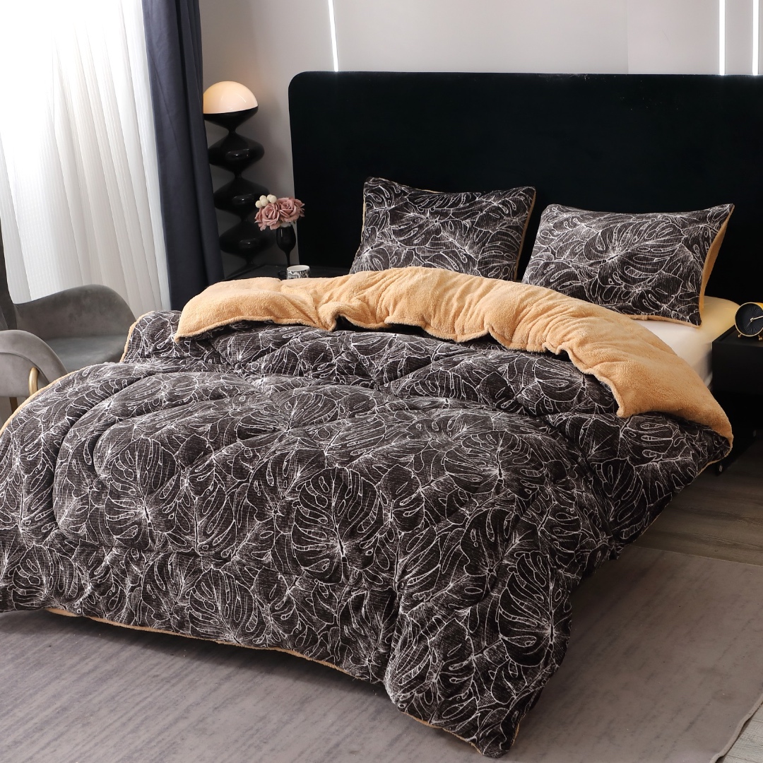 Pilota Cocolino cu Blanita Bej Ultra Pufoasa, Matlasata, 200x230cm + 2 fete de perna 50x70cm – Caldura Instanta si Confort de Lux pentru Nopti Reci, Negru, Alb, frunze