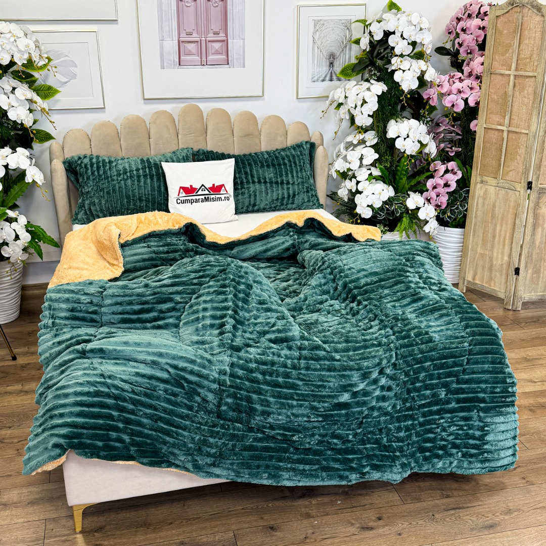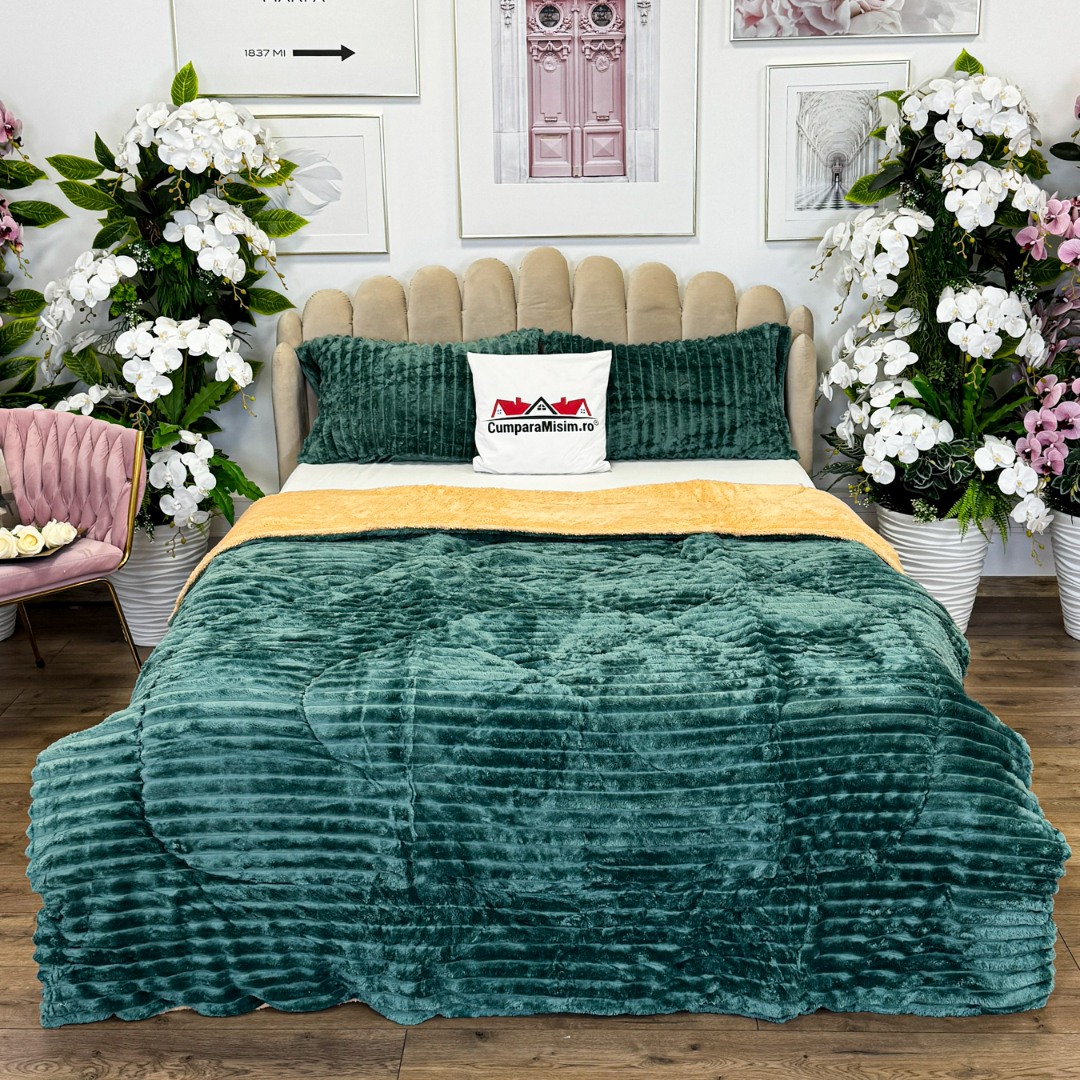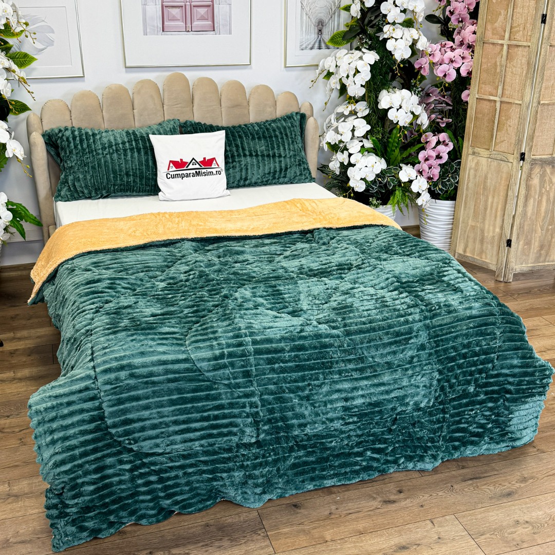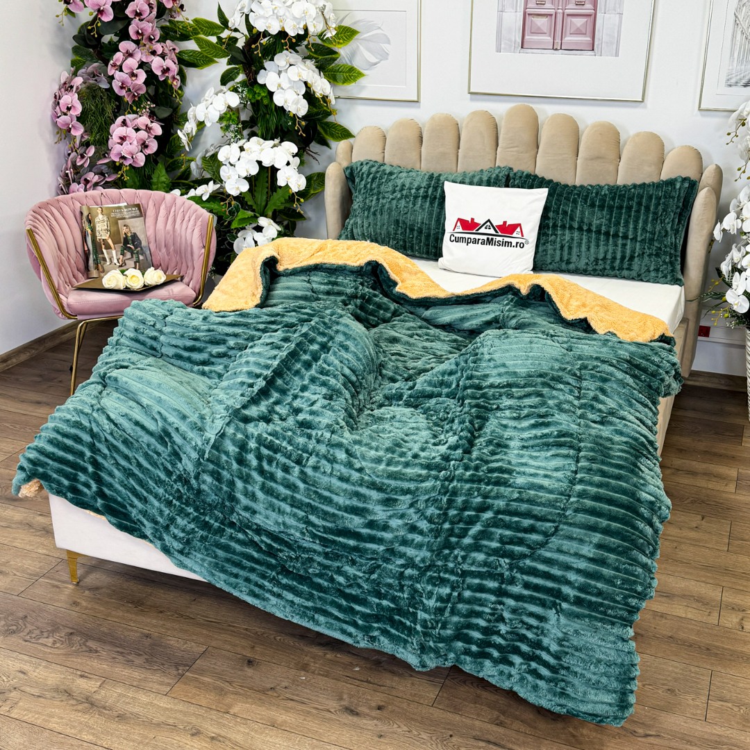 Pilota Groasa cu Fata din Blanita Artificiala de Iepure si Dos din Blanita Sherpa Maro, Umplutura Vatelina Siliconica, 200x230 cm + 2 fete de perna 50x70cm - Confort Termic Premium si Eleganta pentru Nopti Racoroase, Verde