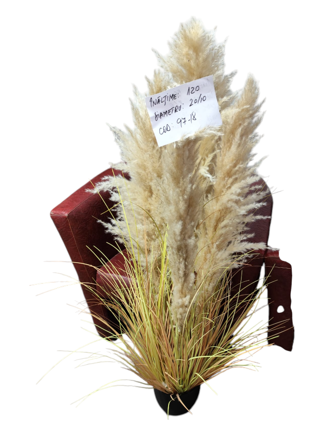 Plantă Decorativă Engros – Iarbă de Pampas Artificială (Cortaderia Selloana) în Ghiveci Negru, Cu Aspect Natural și Impunător, Ideală pentru Amenajări Interioare! Vă propunem spre vânzare engros această plantă decorativă tip iarbă de pampas artificială, o piesă de accent impresionantă și modernă, perfectă pentru a aduce o notă de eleganță boho-chic și volum oricărui spațiu, fără a necesita întreținere. Cu un aspect realist și dimensiuni generoase, este ideală pentru magazine de decorațiuni interioare, florării artificiale, supermarketuri, magazine de mobilă și retaileri online. Caracteristici și Beneficii Cheie pentru Partenerii Noștri: Aspect Natural și Voluminos: Prezintă multiple spice pufoase de culoare crem-aurie, combinate cu frunze lungi, subțiri, de un verde deschis spre galben la bază. Aceasta imită fidel aspectul impunător al ierbi de pampas naturale.Fără Întreținere: Fiind o plantă artificială, nu necesită udare, lumină specială, tundere sau orice altă îngrijire, fiind perfectă pentru clienții cu un stil de viață aglomerat sau pentru spații unde plantele naturale nu supraviețuiesc.Dimensiuni Impunătoare: Cu o înălțime de 120 cm și un diametru de 20/30 cm, este o piesă de decor de impact, ideală pentru a umple spații ample sau pentru a crea un punct focal.Ghiveci Simplu și Stabil: Vine într-un ghiveci negru, discret, care asigură stabilitatea și permite integrarea ușoară în diverse tipuri de jardiniere sau spații.Versatilitate în Decor: Ideală pentru decorarea livingurilor spațioase, holurilor, recepțiilor, birourilor moderne, hotelurilor, restaurantelor sau spațiilor comerciale, adăugând un element de design contemporan.Durabilitate: Fabricată din materiale de calitate, își păstrează forma și aspectul pufos în timp, fără a se ofili sau deteriora.Soluție Economică: Oferă beneficiile estetice ale ierbi de pampas naturale la un cost mult mai mic pe termen lung, eliminând cheltuielile și efortul de întreținere. Ideală pentru Diverse Segmente de Piață B2B: Magazine de Decorațiuni Interioare: Un produs vedetă pentru amenajările moderne și boho-chic.Florării (cu secțiune de flori artificiale): Completează oferta de aranjamente și plante artificiale cu o opțiune de volum.Supermarketuri și Hipermarketuri: Atrage clienții în căutare de soluții practice și estetice de decor.Magazine de Mobilier și Home Decor: Poate fi vândută alături de mobilier pentru a accentua stilul.Companii de Amenajări Interioare și Birouri: Perfectă pentru proiecte de design și decorare a spațiilor de lucru.