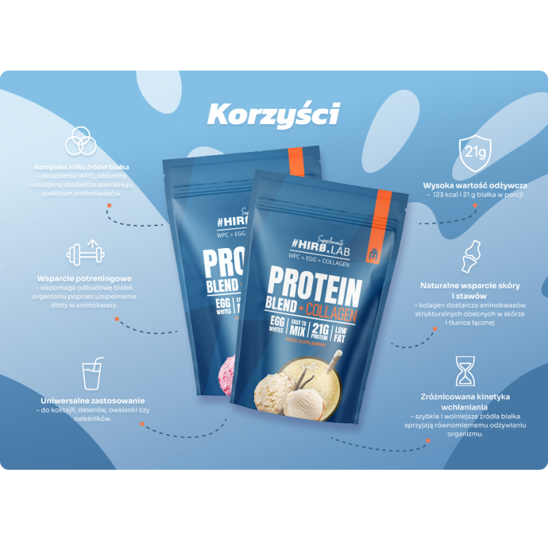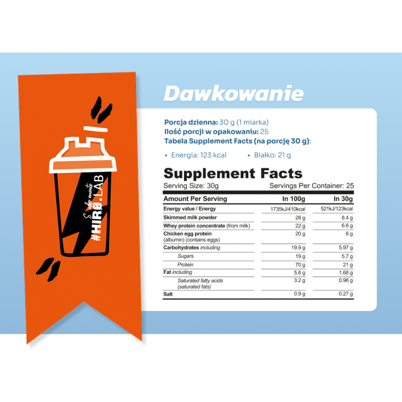Protein Blend + Collagen pulbere 750 grame - Vanilie, Hiro.Lab 21 grame de proteine și doar 123 kcal per porție – ideal pentru cei atenți la silueta lor. O combinație unică de 4 surse de proteine – colagen, concentrat de zer (WPC), albuș de ou (albumină) și lapte degresat. O bogăție de aminoacizi esențiali – inclusiv BCAA și glutamină – susțin dezvoltarea musculară. Suport natural pentru țesutul conjunctiv – colagenul furnizează glicină, prolină și hidroxiprolină, care lipsesc dintr-o dietă tipică. Fără lactoză (albumină) – potrivit și pentru persoanele cu intoleranță la lactoză. De ce să folosiți Amestec Proteic + Colagen? Acest amestec unic de proteine a fost creat pentru a oferi un suport complet organismului. Nu numai că oferă proteine de înaltă calitate pentru a susține creșterea și recuperarea musculară, dar completează și dieta cu colagen – o proteină naturală a țesutului conjunctiv responsabilă pentru elasticitatea pielii, articulații puternice și tendoane sănătoase. Este alegerea perfectă pentru cei care doresc să aibă grijă simultan de mușchii lor și de sănătatea întregului sistem musculo-scheletic. Beneficii de utilizare Utilizarea Amestecului de Proteine + Colagen oferă numeroase beneficii care vor fi apreciate atât de persoanele active fizic, cât și de cei care urmează o dietă sănătoasă și echilibrată. Datorită profilului său complet de aminoacizi, suplimentul susține recuperarea musculară, accelerând reconstrucția fibrelor după antrenamente intense. Prezența BCAA și a glutaminei îl face o bază solidă pentru construirea masei musculare și creșterea forței, ceea ce este deosebit de important pentru sportivi și cei care fac exerciții fizice în mod regulat. Unul dintre ingredientele cheie este colagenul - o proteină responsabilă de menținerea sănătății articulațiilor și a țesutului conjunctiv. Acesta oferă aminoacizi unici, cum ar fi glicina, prolina și hidroxiprolina, care lipsesc adesea dintr-o dietă tipică. Aceasta înseamnă că suplimentul nu numai că susține mușchii, ci și întregul sistem musculo-scheletic. Un avantaj suplimentar al produsului este biodisponibilitatea ridicată a proteinei. Albumina și concentratul de proteine din zer garantează o absorbție excelentă și o utilizare eficientă a nutrienților furnizați de organism. Acest lucru asigură că fiecare porție este cât mai eficientă posibil. Mai mult, suplimentul are un conținut scăzut de calorii – o porție conține doar 123 kcal – fiind în același timp foarte sățios. Acest lucru îl face un adaos excelent pentru dietele de slăbire, ajutându-vă să vă gestionați greutatea fără a sacrifica o sursă valoroasă de proteine. Pentru cine este recomandat Amestecul de proteine + Colagen? Amestecul de proteine + Colagen este un produs conceput pentru o gamă largă de persoane care doresc să aibă grijă de sănătatea și fitness-ul lor într-un mod complet. Este perfect pentru sportivi și persoane active fizic, deoarece susține creșterea masei musculare și accelerează recuperarea după antrenamente intense. Datorită conținutului ridicat de colagen, acest supliment este, de asemenea, o alegere excelentă pentru cei preocupați de sănătatea articulațiilor și a oaselor – ajută la menținerea sănătății sistemului musculo-scheletic și susține buna funcționare a acestuia. Datorită conținutului scăzut de calorii și a conținutului ridicat de proteine, produsul este un suport ideal pentru dietele de slăbire, facilitând controlul greutății fără a sacrifica nutriția nutritivă. Albumina conținută în amestec este în mod natural fără lactoză, ceea ce îl face o soluție sigură pentru persoanele cu intoleranță la lactoză. Acest lucru face ca Protein Blend + Collagen să fie o sursă universală de proteine - gustoasă, ușor digerabilă și versatilă, recomandată practic oricui dorește să își îmbogățească dieta cu proteine de înaltă calitate. Compoziție și importanța acestora Colagen (peptide de colagen) - o proteină naturală a țesutului conjunctiv care susține articulațiile, oasele, pielea și tendoanele și oferă, de asemenea, aminoacizii rari glicină, prolină și hidroxiprolină. Concentrat proteic din zer (WPC) - o proteină din lapte rapid digerabilă, cu un profil complet de aminoacizi. Conține BCAA și glutamină - cruciale pentru creșterea și recuperarea musculară. Proteină din ou (albumină) - standardul de aur al proteinelor (BV=100), ușor digerabilă și natural fără lactoză. Lapte praf degresat - o sursă suplimentară de proteine și calciu, precum și o bază pentru consistența și aroma cremoasă. Amestec de proteine + colagen 750g este un supliment proteic modern care combină beneficiile a patru surse de proteine. Acesta oferă o cantitate impresionantă de 70g de proteine la 100g de produs, susținând dezvoltarea musculară, recuperarea și sănătatea articulațiilor și oaselor. Este o opțiune excelentă pentru cei care doresc să combine beneficiile suplimentării cu proteine cu sprijinul zilnic pentru sistemul musculo-scheletic. Porție: 30g (1 cupă) Porții per recipient: 25 Dimensiune pachet: 750g Ingrediente: colagen (peptidă de colagen), lapte praf degresat, concentrat proteic din zer (din lapte), emulgator: lecitină (din semințe de floarea-soarelui), albuș de ou (albumină) (din ou), regulator de aciditate: acid malic, aromă, îndulcitor: sucraloză. Poate conține soia și nuci. Valori nutriționale la 100g de produs la 30g de produs Valori energetice 1735kJ / 410kcal 521kJ / 123kcal Lapte praf degresat 28g / 8,4g Concentrat proteic din zer (conține lapte) 22g / 6,6g Proteine din ou (albumină) (conține ouă) 20g / 6g Carbohidrați, inclusiv 19,9g / 5,97g - zaharuri 19g / 5,7g - proteine 70g / 21g Grăsimi, inclusiv 5,6g / 1,68g - inclusiv acizi grași saturați (acizi gr