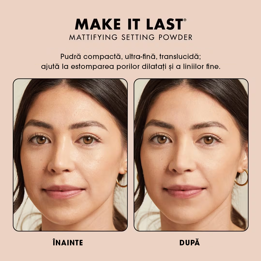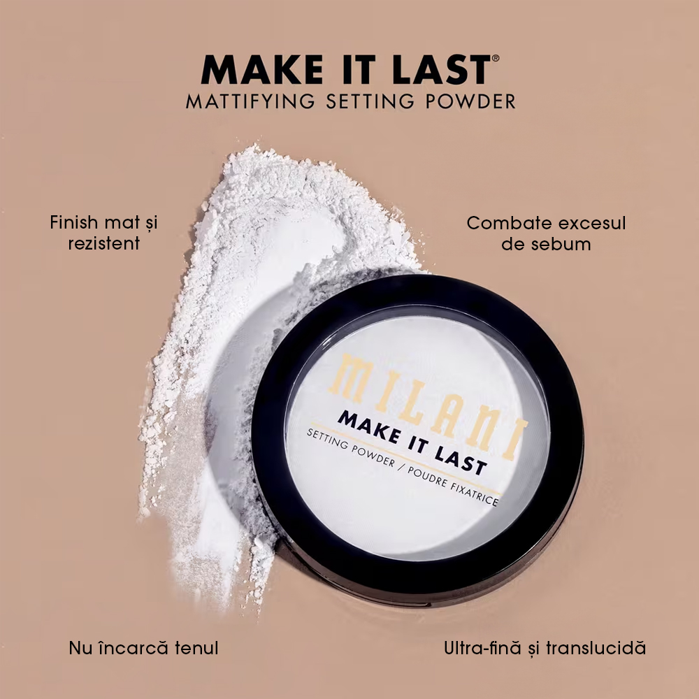 Milani Make It Last Pressed Setting Powder Matte este pudra compactă care oferă un finish mat impecabil și rezistență îndelungată machiajului. ✔ Cruelty-free✔ Vegan✔ Made in Italy Ce face? ✔ Controlează sebumul și reduce vizibil luciul✔ Fixează machiajul și prelungește rezistența acestuia✔ Oferă un finish mat, neted și natural✔ Estompează porii dilatați și liniile fine datorită microparticulelor✔ Ideală pentru fixarea produselor cremoase Formula ✔ Pudră compactă, translucidă și ultra-fină✔ Ușoară, nu încarcă tenul și nu se adună în linii✔ Potrivită pentru toate tipurile de ten Cum se folosește? 1. Preia pudra cu o pensulă pufoasă și îndepărtează excesul.2. Aplică prin mișcări de tapotare sau ștergere, pe întreaga față sau doar pe zonele cu exces de sebum.3. Folosește-o singură pentru un look natural sau peste produsele de ten pentru fixare.4. Reaplică pe parcursul zilei pentru retușuri rapide. Potrivit pentru: Persoanele care își doresc un ten mat, uniform și fără luciu, indiferent de tipul de piele. Ideală pentru purtarea zilnică și pentru menținerea machiajului fresh ore întregi.Se recomandă efectuarea unui test de alergie înainte de utilizare.