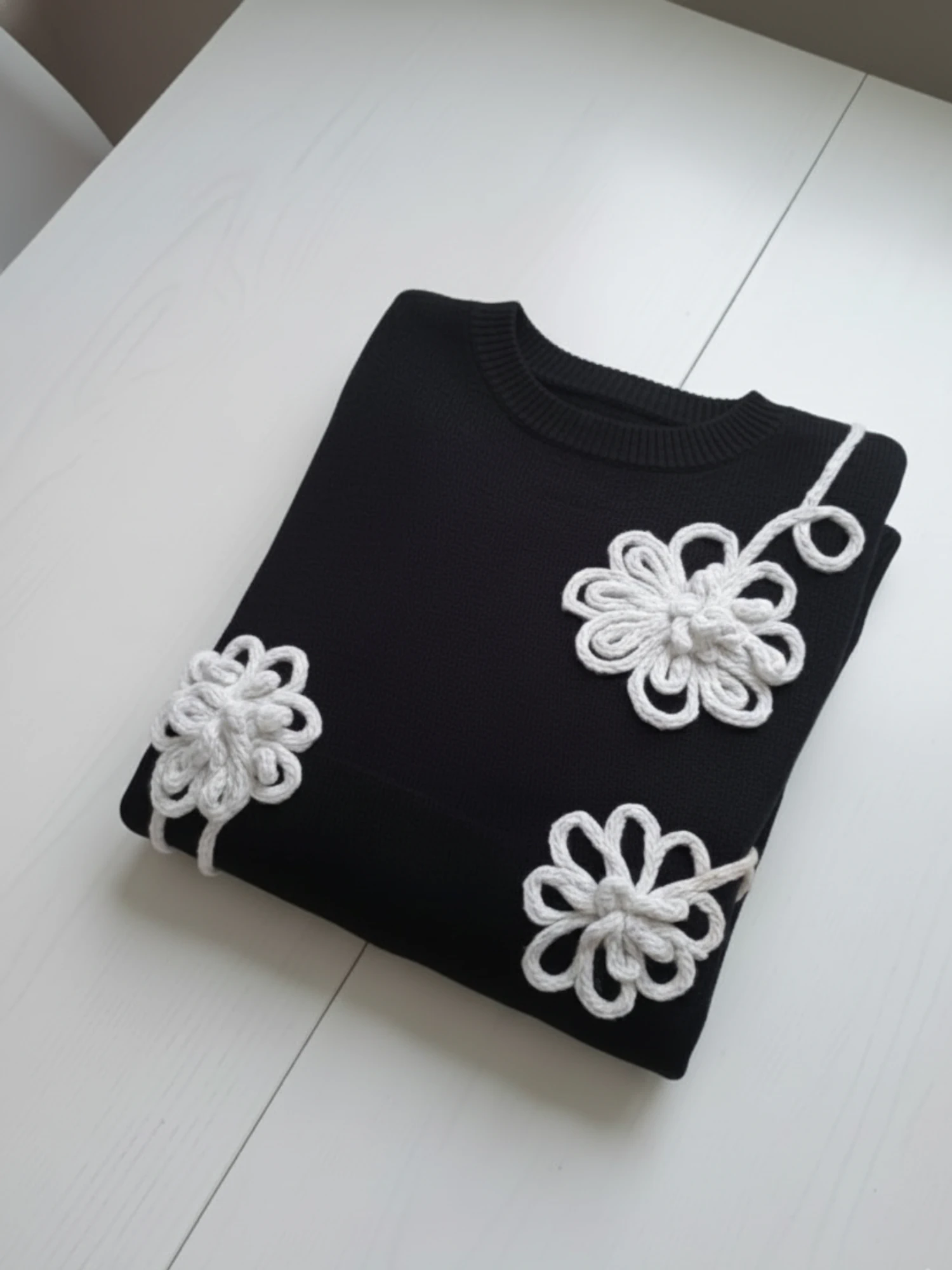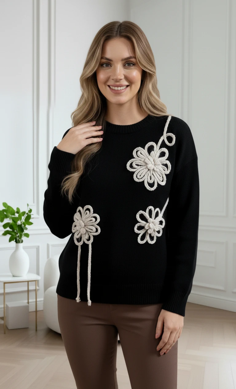Pulover negru din tricot cu flori tricotate în relief, care impresionează prin designul său rafinat și delicat, fiind alegerea perfectă pentru femeile care apreciază detaliile fine și confortul termic. Realizat dintr-un material moale și plăcut la atinger
