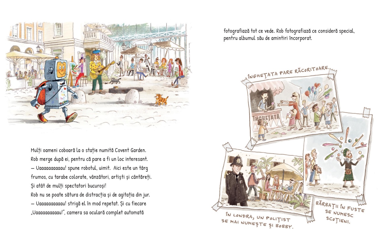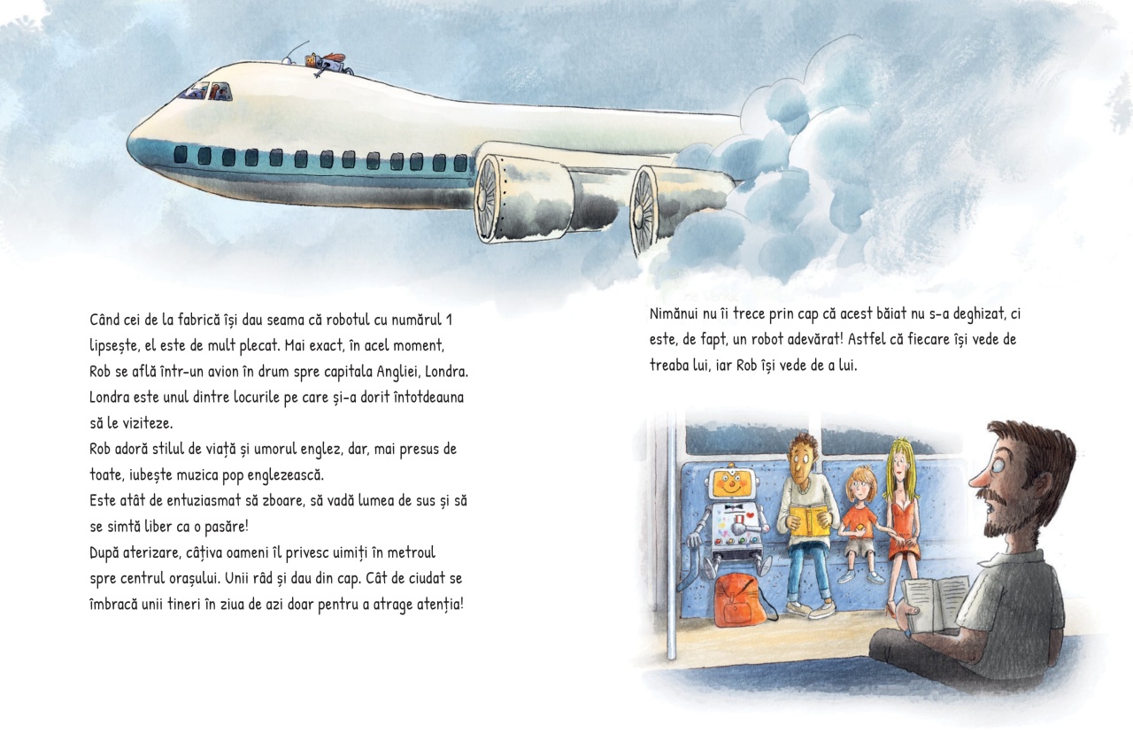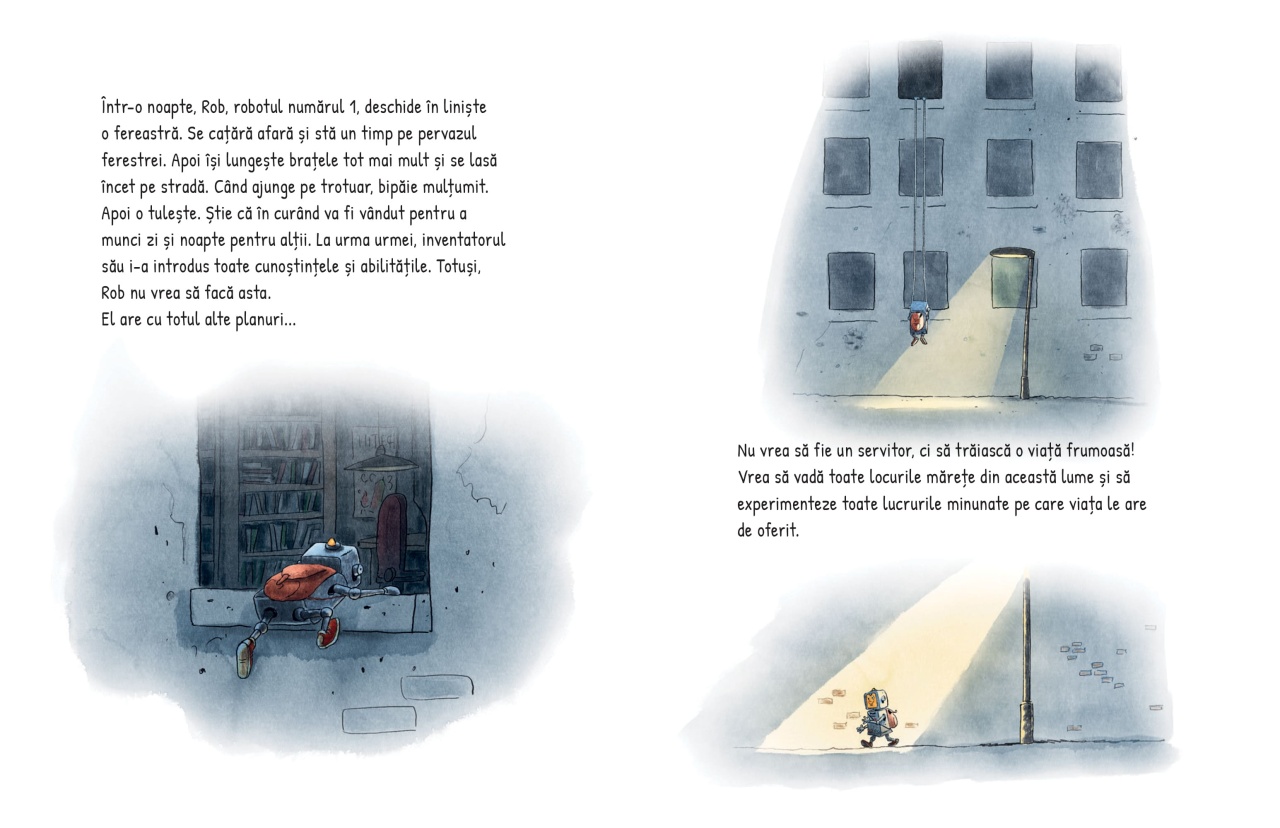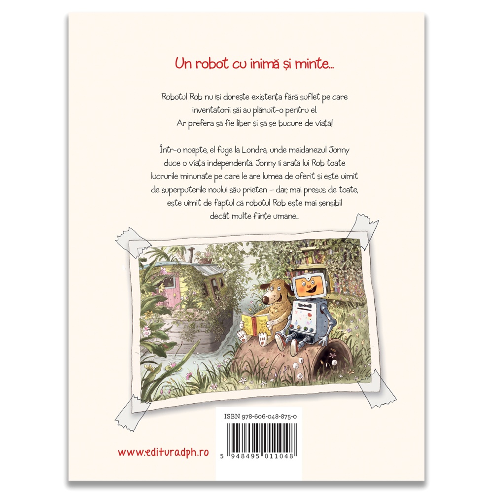 Un robot cu inimă și minte... Rob este un robot cu visuri mai mari decât programul său: vrea să fie liber și să se bucure de viață! Într-o noapte, evadează din fabrica în care a fost creat și fuge la Londra, unde îl întâlnește pe Jonny, un cățel vagabond, prietenos și plin de inițiativă. Împreună explorează orașul, descoperă locuri, salvează animale, dansează în stradă și le oferă celor din jur momente de neuitat. Această poveste minunat ilustrată îmbină aventură, prietenie, empatie și umor, într-o carte caldă care îi învață pe cei mici despre bunătate, curaj, libertate și ce înseamnă cu adevărat să fii uman. Despre autor: Walko este un autor și ilustrator german de literatură pentru copii, cunoscut pentru poveștile sale pline de umor și aventură. După finalizarea unei ucenicii în domeniul tipografiei, a lucrat ca grafician și ilustrator independent, precum și ca artist de fundal și designer de producție pentru filme de animație. Stilul său distinctiv combină ilustrații expresive cu povești care promovează valori precum prietenia, curajul și empatia. Cărțile sale sunt apreciate pentru capacitatea de a aborda teme importante într-un mod accesibil și captivant pentru copii. În prezent, Walko continuă să creeze povești care încântă și educă, consolidându-și reputația ca unul dintre autorii de referință în literatura germană pentru copii. Caracteristici: Autor: Walko Mărimi: 17 x 22 Vârstă: 5 – 8 ani Copertă: Cartonată