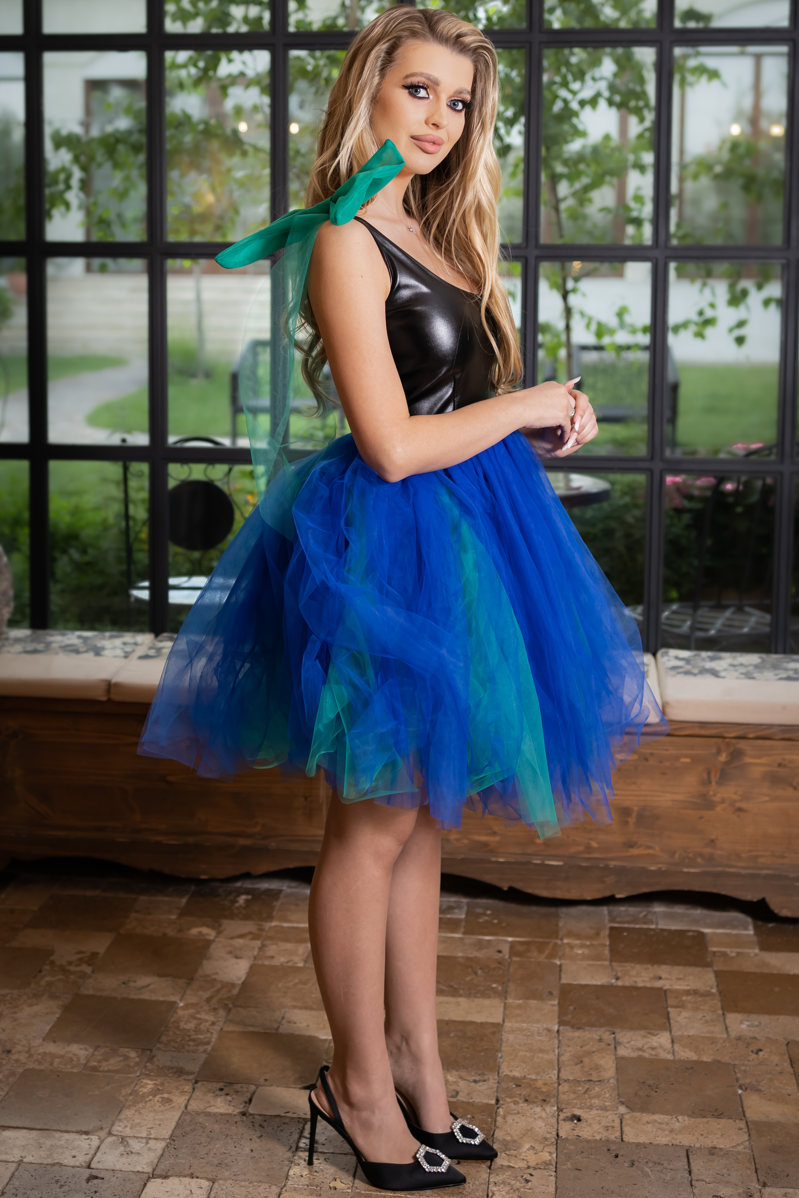 Rochie, eleganta cu corset din piele ecologica si tulle.Culoare: negru, albastru si verdeCroi: corset si croi in closTextura: piele, tulleInchidere cu fermoar la spateCompozitie: 100% poliester Modelul are 1,70 m inaltime si poarta masura S. INFO: Echipa noastra face toate eforturile in a prezenta cat mai bine culorile produselor prezentate pe site insa culorile pot diferi de situatia reala si pot varia in functie de setarile monitorului/dispozitivului dvs! Instructiuni folosire: