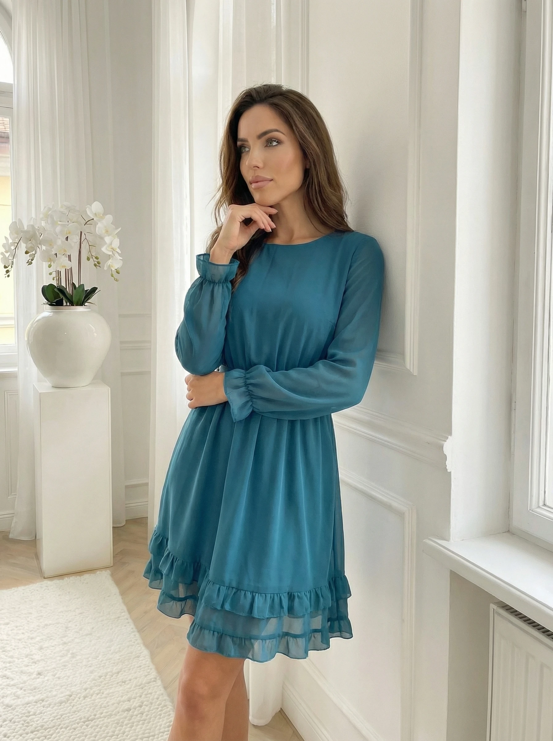 Rochie eleganta scurta turcoaz cu volane si curea in talie, perfecta pentru aparitii feminine si stilate. Croiul lejer este completat de o curea in talie ce evidentiaza silueta, oferind un look echilibrat si modern. Manecile lungi, usor transparente, adau