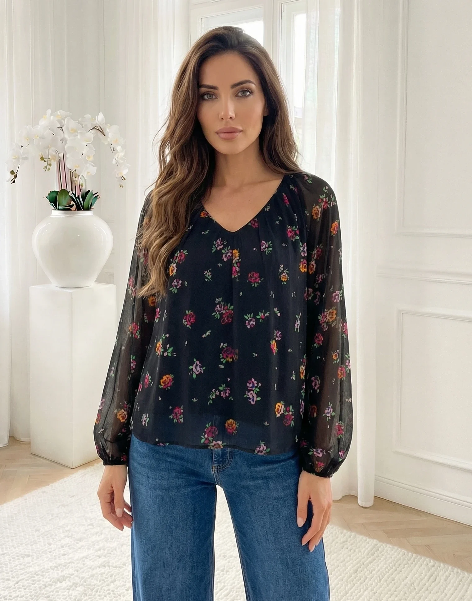 Rochie neagra cu decolteu petrecut si pliuri elegante este alegerea ideala pentru un look feminin si elegant in orice moment al zilei. Designul cu decolteu petrecut evidentiaza zona bustului, oferind un plus de rafinament, in timp ce manecile scurte cu vo