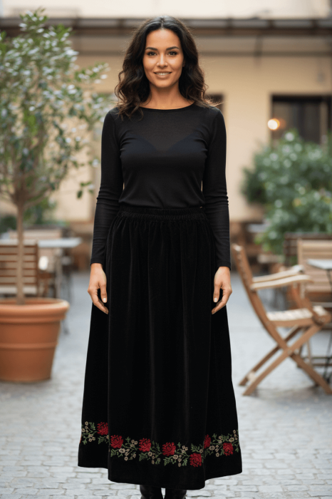 Rochie neagra midi cu 2 girafe, din vascoza, cu un desen , girafa aplicata. Decolteul este rotund iar manecile sunt 3 4 . La baza gatului este brodata
