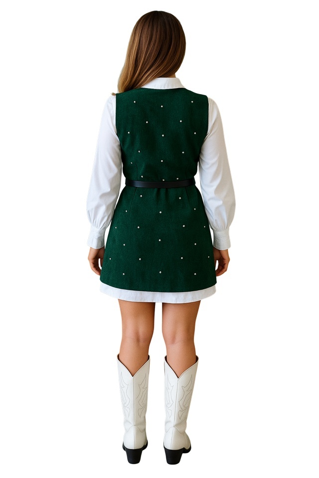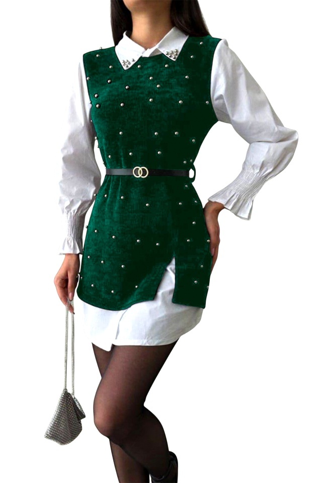 Rochie office tip camasa Iuliana, cu sarafan, paiete si curea, Verde, Marime S/M