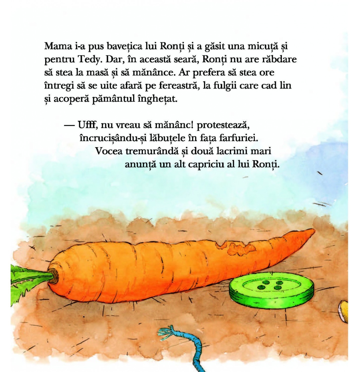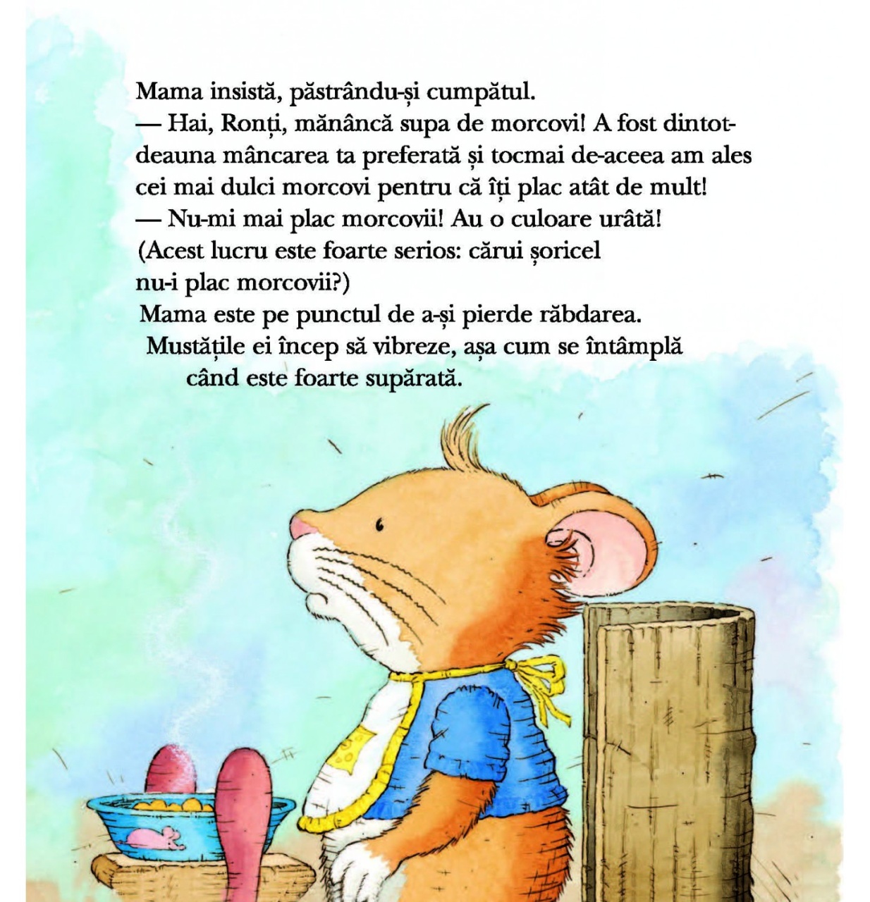 Ronți Ronț este un mâncăcios, dar în seara aceasta nu vrea să-și mănânce nici măcar supa delicioasă de morcovi... Ronți Ronț face mofturi, la fel ca alți copii. Dar mama lui știe ce are de făcut: Îi arată de ce nu este bine să fie capricios, iar acesta redevine un șoricel cuminte și ascultător. Cum face asta? Specificații Pagini: 32 Mărimi: 23.5 x 26 cm Copertă: Cartonată