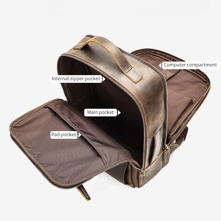 interior captusit; 2 compartimente principale; 1 compartiment pentru laptop; 1 buzunar interior cu fermoar; 1 buzunar interior fara inchidere; 2 buzunare exterioare fata cu fermoar; 2 buzunare laterale; barete ajustabile; material: piele naturala; accesorii de culoare aurie; greutate: 1.5 kg; dimensiuni: 30 x 15 x 42 cm. Important : Culoarea produsului poate varia ușor datorită luminozității monitorului. Din cauza varietății instrumentelor de măsură, pot exista ușoare erori de cm.