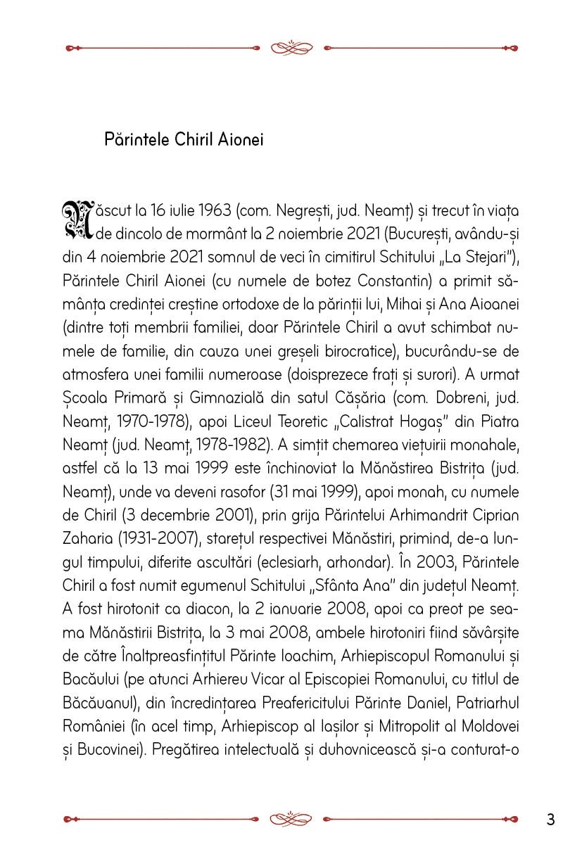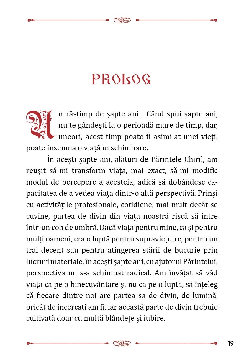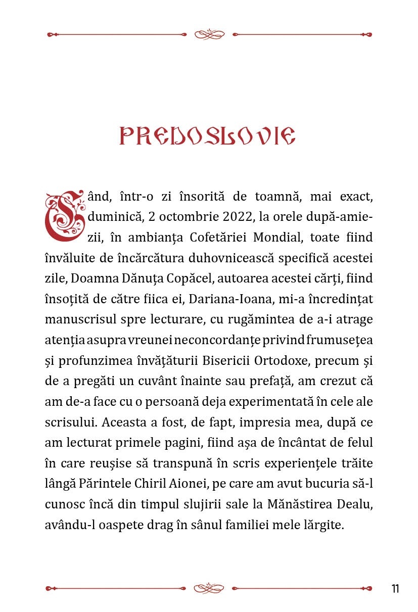 Autoarea Dănuța Copăcel a dorit să-i facă cunoscut, oricărui cititor, folosul duhovnicesc, pe care Părintele Chiril Aionei, personajul principal din cartea intitulată sugestiv Șapte ani de „La Stejari”, l-a adus, prin mărturia și trăirile sale, în viața ei și a fiicei sale, dar și în viața celor ce, din diferite pricini, îl căutau. Într-o lume în care spiritualitatea de import este întâlnită la tot pasul, în care teoriile și erudiția teologică sunt prea complexe, exemplele vii ale Părintelui Chiril, din care izvorau „cuvinte cu putere multă”, erau capabile să se coboare din rațiune în inima omului, mai mult sau mai puțin credincios. În carte sunt evocați ultimii șapte ani din viața acestui Părinte de vrednică amintire și pomenire, adică chiar din perioada în care părul și barba i-au albit, de pe o zi pe alta, iar schimbarea trăită îl marcase până la măsura de a-l copleși cu greutatea ei, însă, Dumnezeu, cu iubirea Sa, i-a dat un răgaz de șapte ani, pe care i-a petrecut râvnitor pentru cele sfinte și duhovnicești. Astfel, Părintele a izbutit să amenajeze și să înfrumusețeze un așezământ monahal, dar și să fie remarcat ca un duhovnic iscusit, aducând pe calea credinței, spre a-i conduce la mântuire, pe credincioșii de diferite vârste și condiții sociale, neîncrezători și, uneori, cu inimile împietrite de poverile vieții. Dumnezeu i-a mai dat Părintelui și trecerea printr-o boală necruțătoare, a cărei suferință a acceptat-o drept parte a urcușului său duhovnicesc. Pe scurt, Părintele Chiril a făcut, în acești șapte ani, tot ceea ce a considerat necesar, astfel încât, prin mijlocirile Maicii Domnului, pe care o slăvea nespus de mult, invocându-i ajutorul în orice demers, să se afle întru Lumină și dincolo de mormânt.