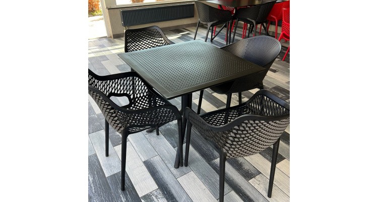 Greutate maxima suportata: 160 kg Inaltime pana la sezut: 45 cm Inaltime: 81 cm Latime: 54 cm Lungime: 60 cm Caracteristici Cu brate Greutate: 4,5 kg Material scaun: Polipropilena Material picior: Polipropilena Culoare scaun: negru Fotoliul Sky Pro este confectionat din polipropilena tratata cu aditivi UV. Se poate utiliza in exterior si in interior. Este foarte durabil, stabil si in acelasi timp usor. • Ranforsat cu fibra de sticla. • Dimensiuni: 60 X 54 X 81 cm. • Produs Certificat CATAS. • Garantia: 3 ani. • Pretul include TVA. • Greutate maxima suportata: 160 kg