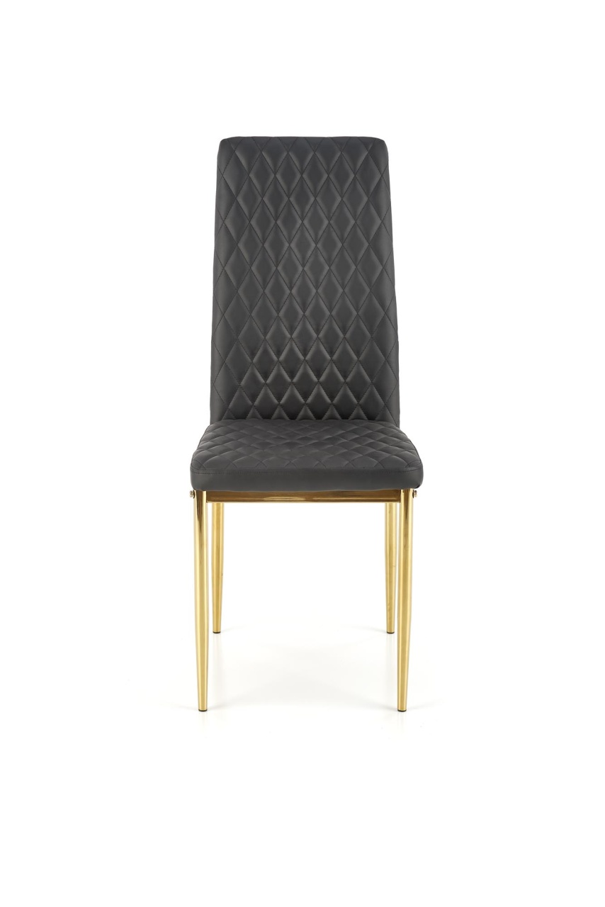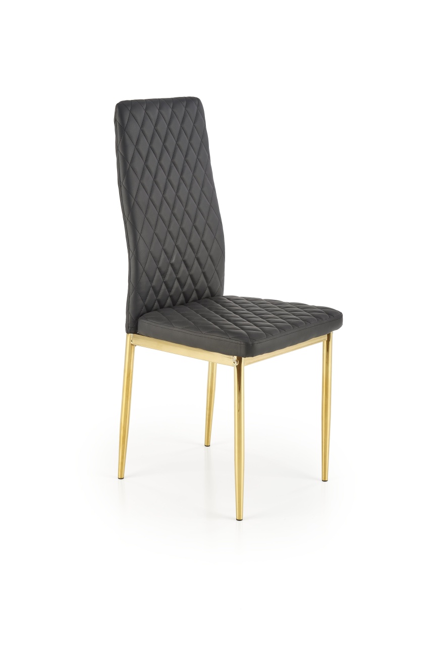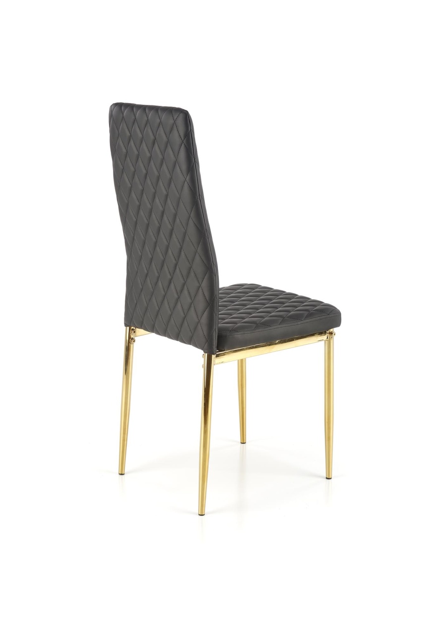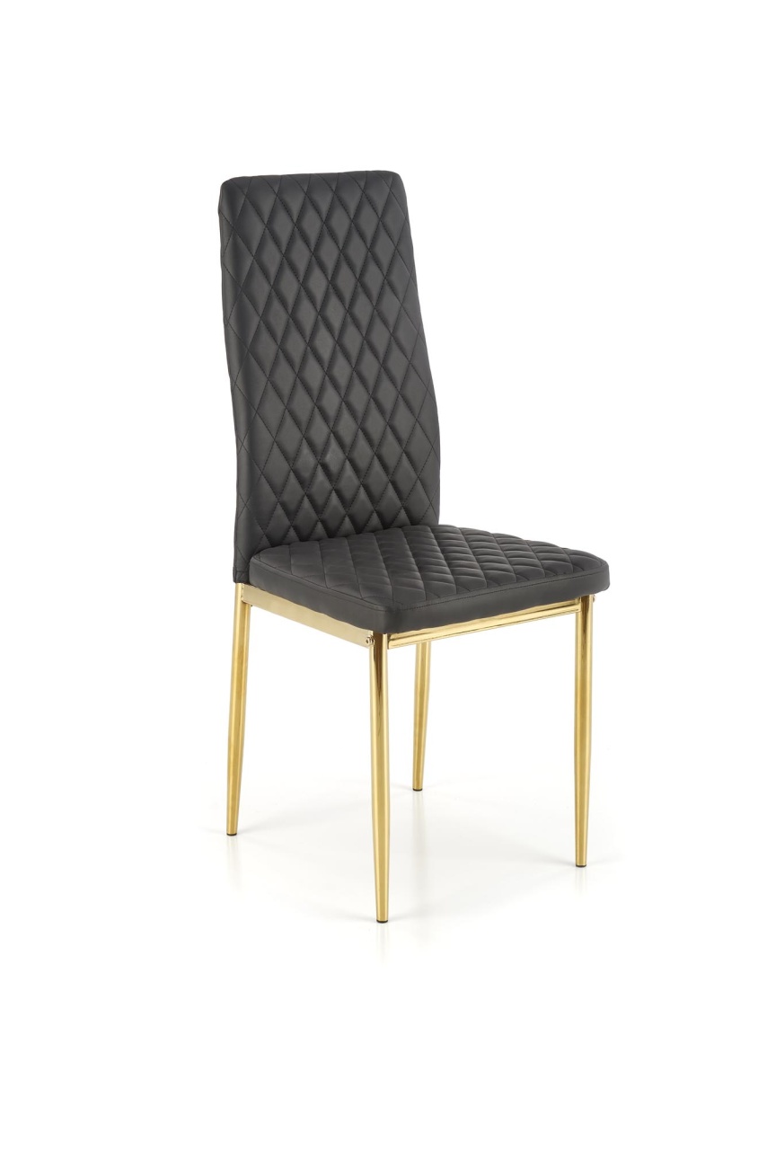 Scaunul K501 reprezintă un element sofisticat și elegant, perfect pentru a aduce o notă de rafinament și stil în orice spațiu. Cu o tapițerie realizată dintr-o piele ecologică moale și luxoasă, acest scaun emană un aer de eleganță și confort. Materialul de înaltă calitate oferă o senzație plăcută la atingere și un aspect vizual încântător. Dimensiuni: Lățime: 40 cm Adâncime: 50 cm Înălțimea totală: 98 cm Înălțimea șezutului față de sol: 46 cm Detalii tehnice: Cadrul este realizat din oțel cromat. Tapițeria este confecționata din piele ecologică. Culoare: negru / auriu Produsul nu este montat, este destinat pentru auto-asamblare. Instrucțiunile de montaj vin în colet.
