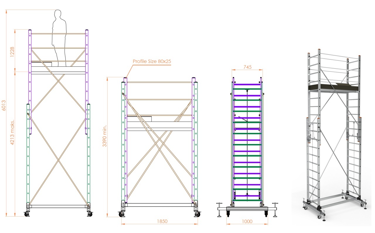 Schela mobila aluminiu telescopica 2x3(m), inaltime lucru 6 metri, o platforma 1,6x0,6(m), max 200kg/mp - CNO-SME-MEGA6 CNO-SME-MEGA6 este o schelă mobilă din aluminiu concepută pentru a lucra la înălțime în condiții de siguranță și eficiență. Este fabricată dintr-un aliaj special de aluminiu, fiind atât ușoară, cât și rezistentă. Schela dispune de un sistem cu scripete și coardă pentru acces ușor și ajustare a înălțimii. PUNCTE FORTE ȘI AVANTAJE Fabricată dintr-un aliaj special de aluminiu 6063, fiind durabilă și rezistentă la rugină. Echipată cu roți cu sistem de blocare pentru o mobilitate ușoară și sistem de fixare-reglare cu 4 șuruburi. Dispune de un sistem cu scripete și coardă pentru ajustarea lină a înălțimii. Include un capac de platformă pentru acces rapid la zona de lucru. Are o platformă de lucru cu dimensiunile de 1600 mm x 600 mm. Are o capacitate maximă de încărcare de 2.0 kN/m². Barele laterale oferă siguranță suplimentară și previn vibrațiile. Treptele au un design exclusiv pentru a preveni alunecarea. Schela este certificată conform standardului TS EN 1004:2006-10. Ușor de asamblat și dezasamblat. UTILIZARE CNO-SME-MEGA6 Această scară-schelă este ideală pentru diverse sarcini care necesită lucru la înălțime, precum lucrări de construcție, renovare, întreținere și instalare. Mobilitatea sa o face potrivită atât pentru utilizare în interior, cât și în exterior. SPECIFICAȚII TEHNICE Material : Aluminiu 6063 Încărcare maximă: 200 kg / mp (2.0 kN/m²) Înălțime aproximativă totală (cu om pe platformă) : 6013 mm Înălțime de lucru (max): 4213 mm Dimensiuni platformă de lucru: 1600 mm x 600 mm Dimensiuni bază: 1850 mm x 1000 mm Dimensiune profil: 80x25 mm Greutate (aproximativă): 75 kg