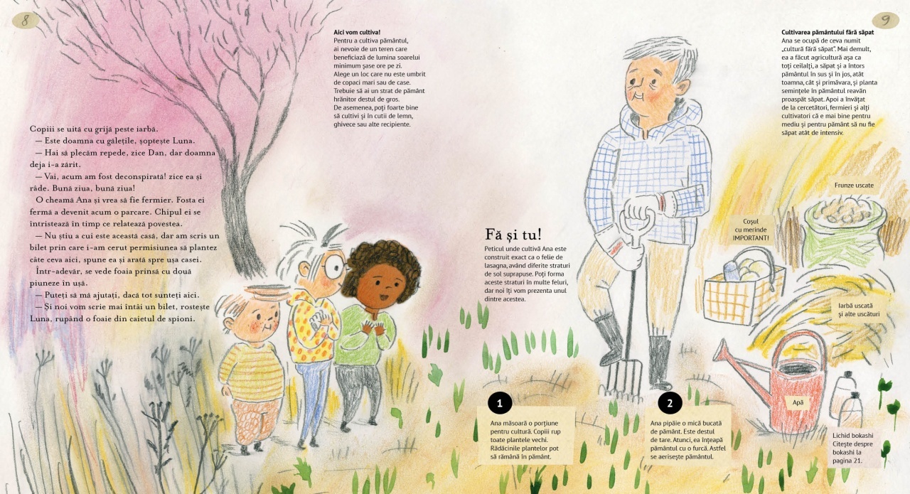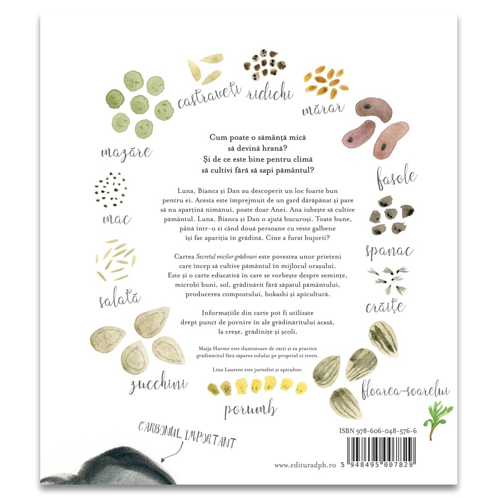 Un punct de plecare excelent pentru activități la școală, grădiniță sau acasă, această carte spune povestea unui grup de copii ce amenajează o grădină... secretă. Fiecare pagină dezvăluie detalii interesante despre viața plantelor și trezește curiozitatea micilor exploratori. În plus, întreaga poveste conturată în jurul secretului celor mici devine și mai misterioasă atunci când grădină dispar bujorii. Cum poate o sămânță mică să devină hrană? Și de ce este bine pentru climă să cultivi fără să sapi pământul? Luna, Bianca și Dan au descoperit un loc foarte bun pentru ei. Acesta este împrejmuit de un gard dărăpănat și pare să nu aparțină nimănui, poate doar Anei. Ana iubește să cultive pământul. Luna, Bianca și Dan o ajută bucuroși. Toate bune, până într-o zi când două persoane cu veste galbene își fac apariția în grădină. Cine a furat bujorii? Cartea Secretul micilor grădinari este povestea unor prieteni care încep să cultive pământul în mijlocul orașului. Este și o carte educativă ce cuprinde povești despre plante, povești despre sol, povești despre apicultură, povești despre semințe, despre microbi buni, dar și despre producerea compostului și bokashi. Pagină cu pagină, cei mici vor descoperi secretele solului și rolul său în sănătatea plantelor, vor învăța despre diversitatea semințelor și tehnici de grădinărit fără săpatul pământului. Despre autor: Maija Hurme este ilustratoare de cărți și ea practică grădinăritul fără săparea solului pe propriul ei teren. Lina Laurent este jurnalist și apicultor. Caracteristici: Pagini: 48 Mărimi: 23 x 25 Autori: Lina Laurent Traducător: Ivona Berceanu Copertă: Cartonată Numărul proiectului: 101059305 Project name: Literatura europeana pentru copii despre ecologie si mediu Project acronym: LECEM