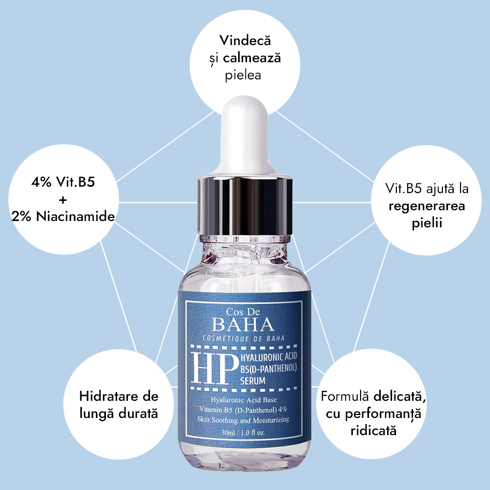 Cos de Baha Hyaluronic+B5 (Panthenol) Serum HP este un ser coreean hidratant și calmant, conceput pentru a menține pielea supla, catifelată și revitalizată. Combinând Acid Hialuronic cu Panthenol și extracte botanice, acest serum oferă hidratare profundă, reduce senzația de uscăciune și redă luminozitatea naturală a tenului, fiind ideal pentru toate tipurile de piele, inclusiv cea sensibilă. De ce merită încercat? ✔ Hidratare intensă și de lungă durată prin Sodium Hyaluronate. ✔ Panthenol și Allantoin calmează și regenerează pielea iritată. ✔ Niacinamide – uniformizează tonul pielii și conferă luminozitate. ✔ Extracte botanice (Trandafir Damasc, Lavandă, Ceai Verde, Melisa, Artemisia) – protejează pielea și reduc efectele stresului oxidativ. ✔ Textură lejeră, se absoarbe rapid, potrivit pentru rutina zilnică de îngrijire a tenului. Ingrediente active și beneficii: Acid Hialuronic – oferă hidratare profundă și menține elasticitatea pielii. Panthenol – regenerează, calmează iritațiile și menține confortul pielii. Niacinamide – uniformizează tonul și îmbunătățește textura pielii. Allantoin – sprijină regenerarea și protecția pielii sensibile. Extracte botanice – Trandafir Damasc, Lavandă, Ceai Verde, Melisa, Artemisia oferă efect calmant, antioxidant și tonifiant. Cum se folosește? Aplică 2-3 picături de Cos de Baha Hyaluronic+Panthenol Serum pe tenul curat, dimineața și/sau seara, înainte de cremă. Masează ușor până la absorbția completă. Poate fi folosit singur sau înainte de alte produse de îngrijire. De ce este special? Acest ser se remarcă prin combinația concentrată de Acid Hialuronic și Panthenol într-o formulă coreeană delicată, care hidratează profund, calmează iritațiile și conferă luminozitate pielii. Este o alegere excelentă pentru cei care caută un produs hidratant, calmant și potrivit pentru toate tipurile de ten. Potrivit pentru: toate tipurile de ten, în special tenul uscat, deshidratat sau sensibil. Notă: Recomandăm efectuarea unui test de alergie înainte de prima utilizare.