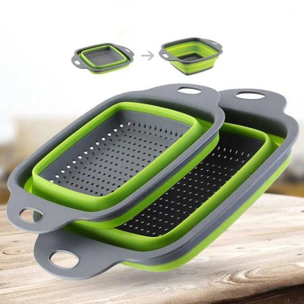 Set 2 castroane pliable cu sita Un set practic si util in orice bucatarie, dar mai ales in camping si picnic. Cu ajutorul acestui set 2 castroane/sita pliabile puteti spala alimentele, dar si servi. Ocupa extrem de putin loc, au dimensiuni diferite si sunt realizate din silicon. dimensiuni castron mic: 24 x 18,5 x 7,7 cm cm dimensiuni castron mare: 29 x 22 x 8,8 cm material: silicon culori in functie de stoc furnizor