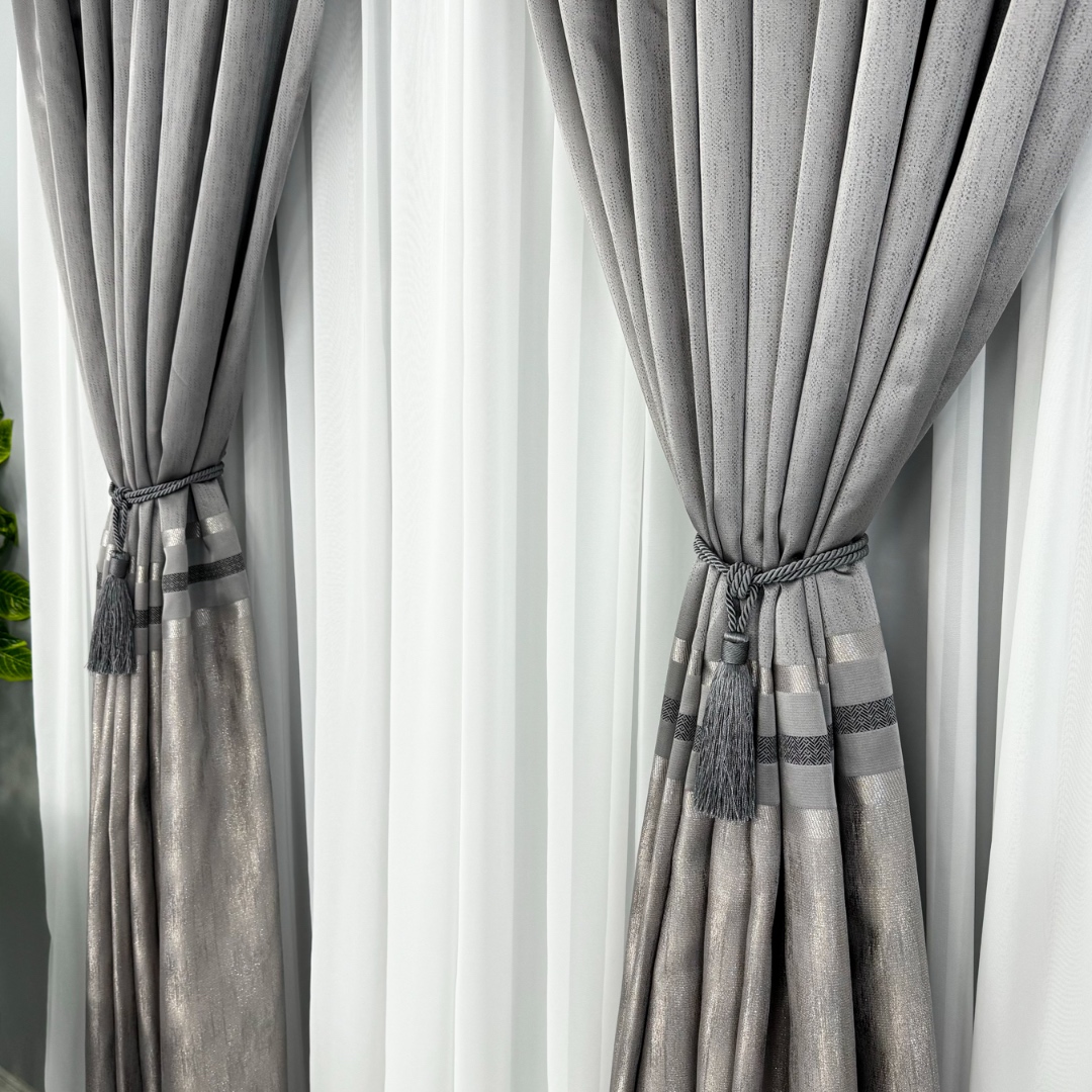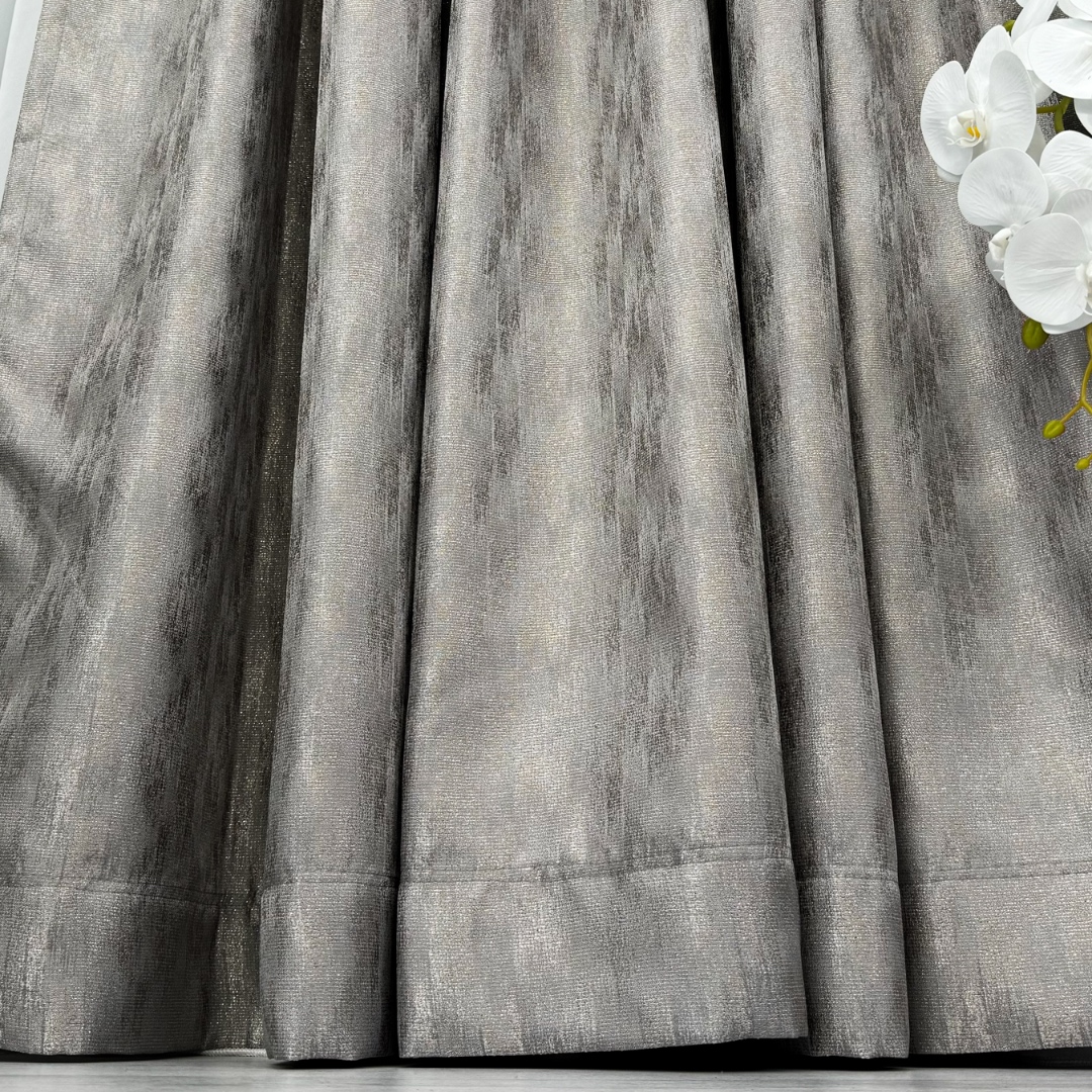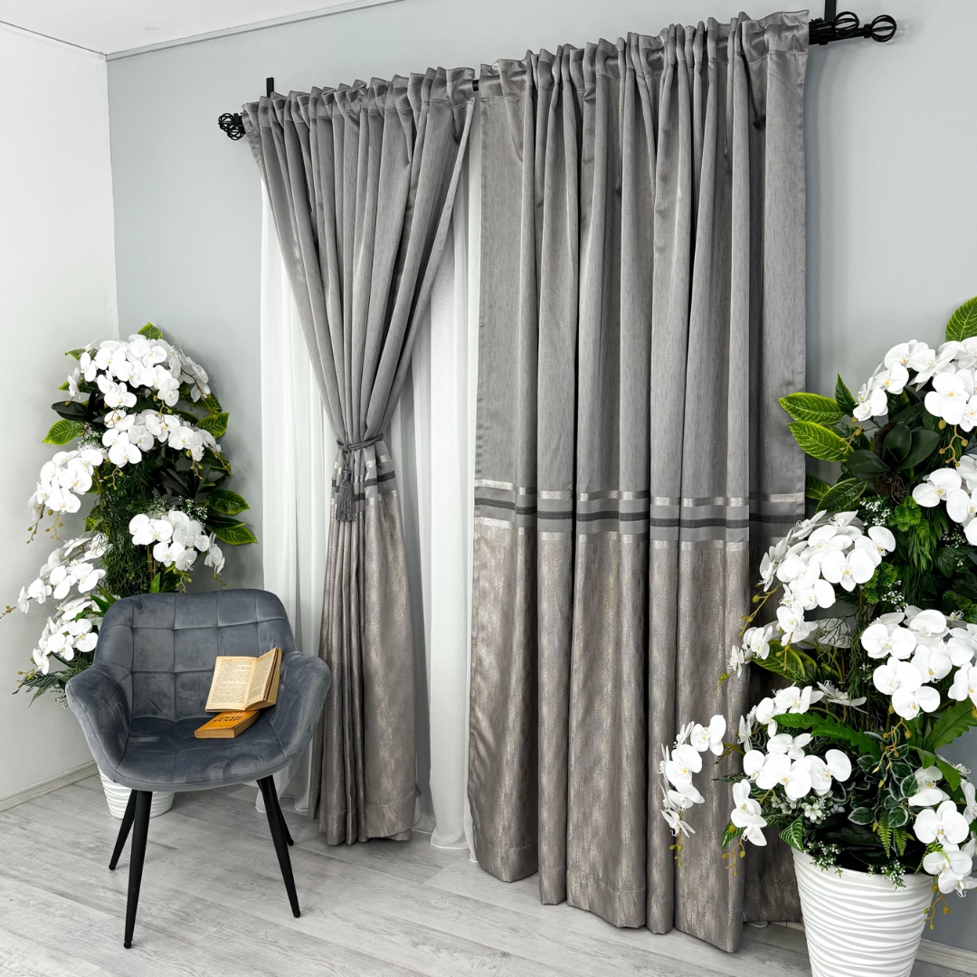 Draperiile Lines reprezinta o alegere sofisticata si luxoasa pentru orice incapere. Aceste draperii sunt confectionate dintr-un material de inalta calitate, care ofera o textura moale si bogata, aducand un sentiment de rafinament si eleganta in orice spatiu.  Ceea ce face draperiile cu adevarat remarcabile sunt detaliile aurii. Aceste insertii metalizate adauga un element de stralucire si glamour, creand un contrast elegant cu textura mata a materialului. Fie ca sunt plasate intr-un li