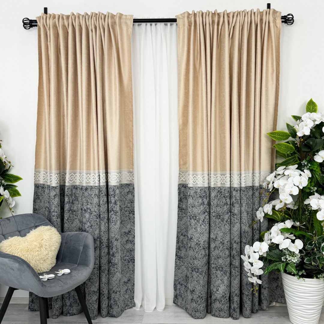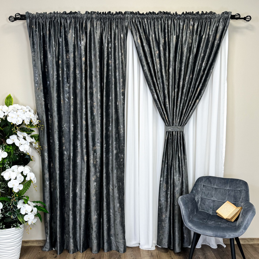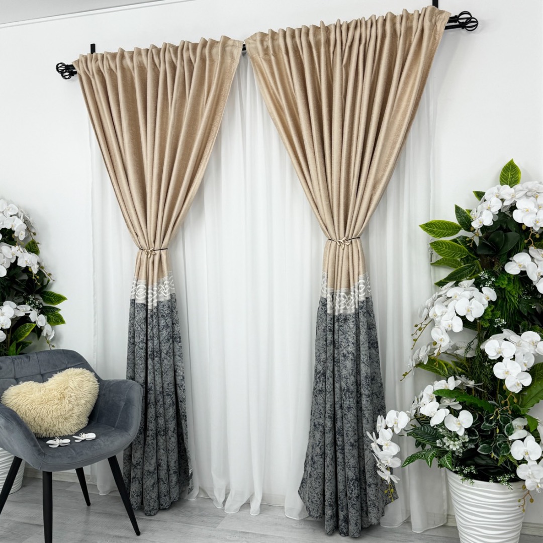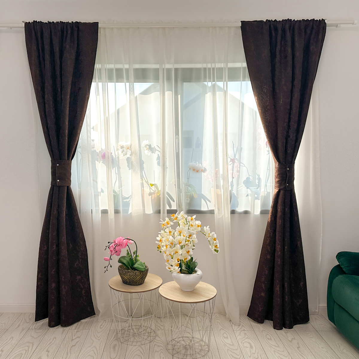 Draperiile Royal reprezinta o alegere sofisticata si luxoasa pentru orice incapere. Aceste draperii sunt confectionate dintr-un material de inalta calitate, care ofera o textura moale si bogata, aducand un sentiment de rafinament si eleganta in orice spatiu. Ceea ce face draperiile cu adevarat remarcabile sunt detaliile aurii. Aceste insertii metalizate adauga un element de stralucire si glamour, creand un contrast elegant cu textura mata a materialului. Fie ca sunt plasate intr-un li