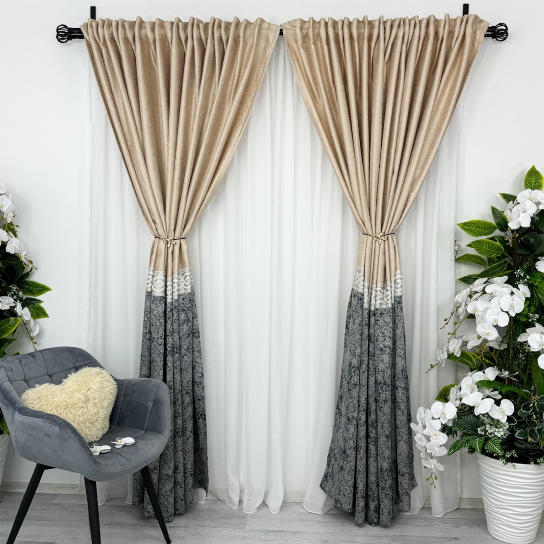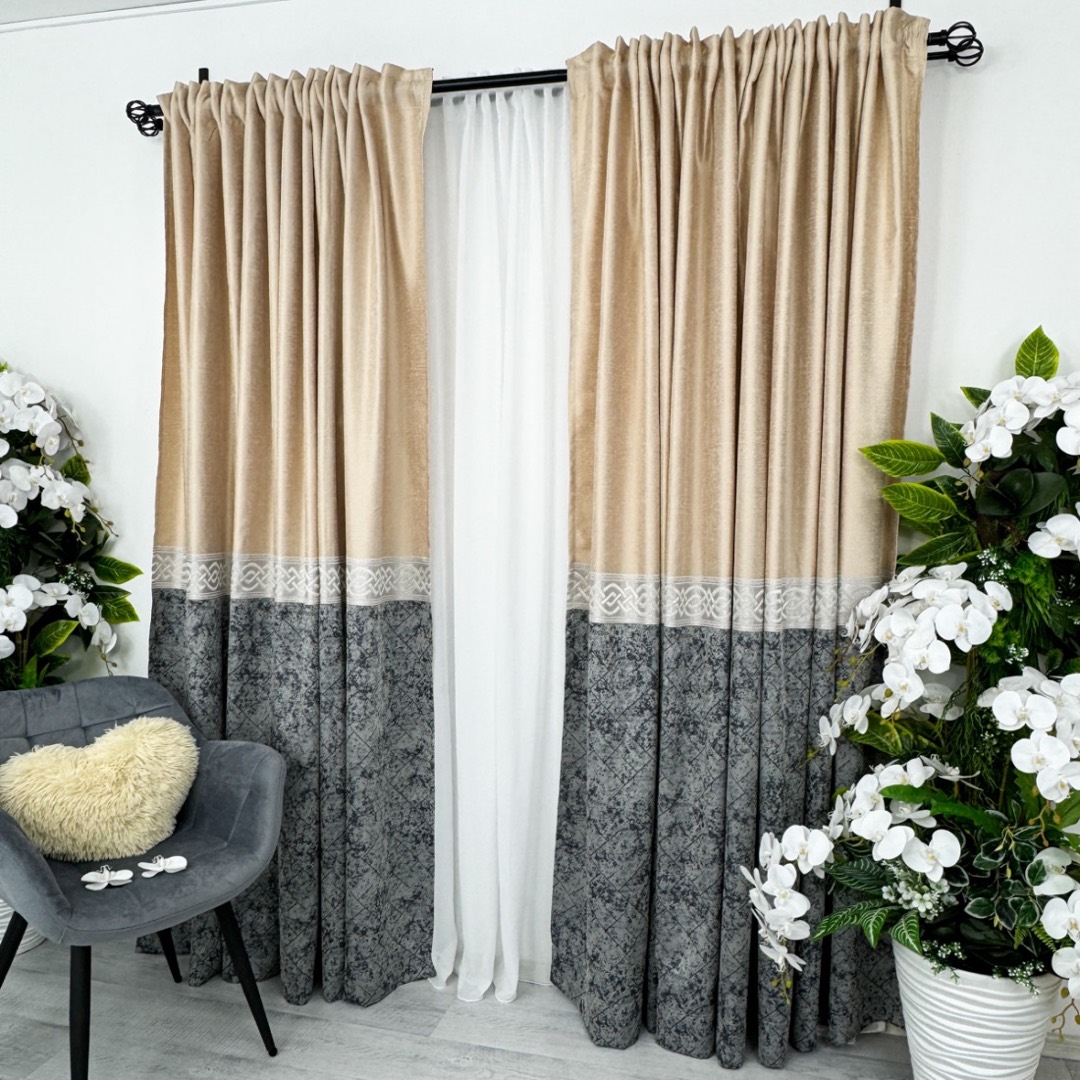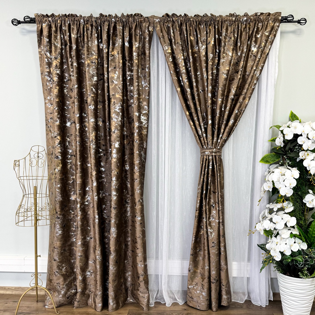 Draperiile Royal reprezinta o alegere sofisticata si luxoasa pentru orice incapere. Aceste draperii sunt confectionate dintr-un material de inalta calitate, care ofera o textura moale si bogata, aducand un sentiment de rafinament si eleganta in orice spatiu. Ceea ce face draperiile cu adevarat remarcabile sunt detaliile aurii. Aceste insertii metalizate adauga un element de stralucire si glamour, creand un contrast elegant cu textura mata a materialului. Fie ca sunt plasate intr-un li