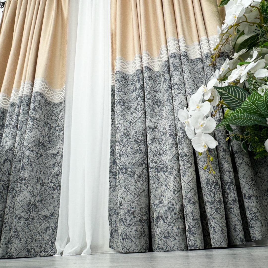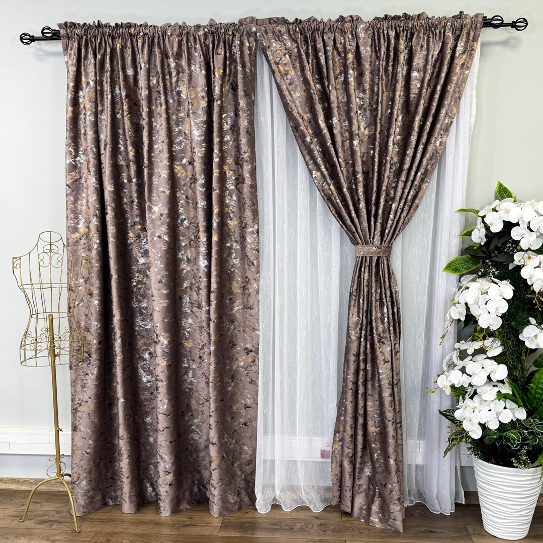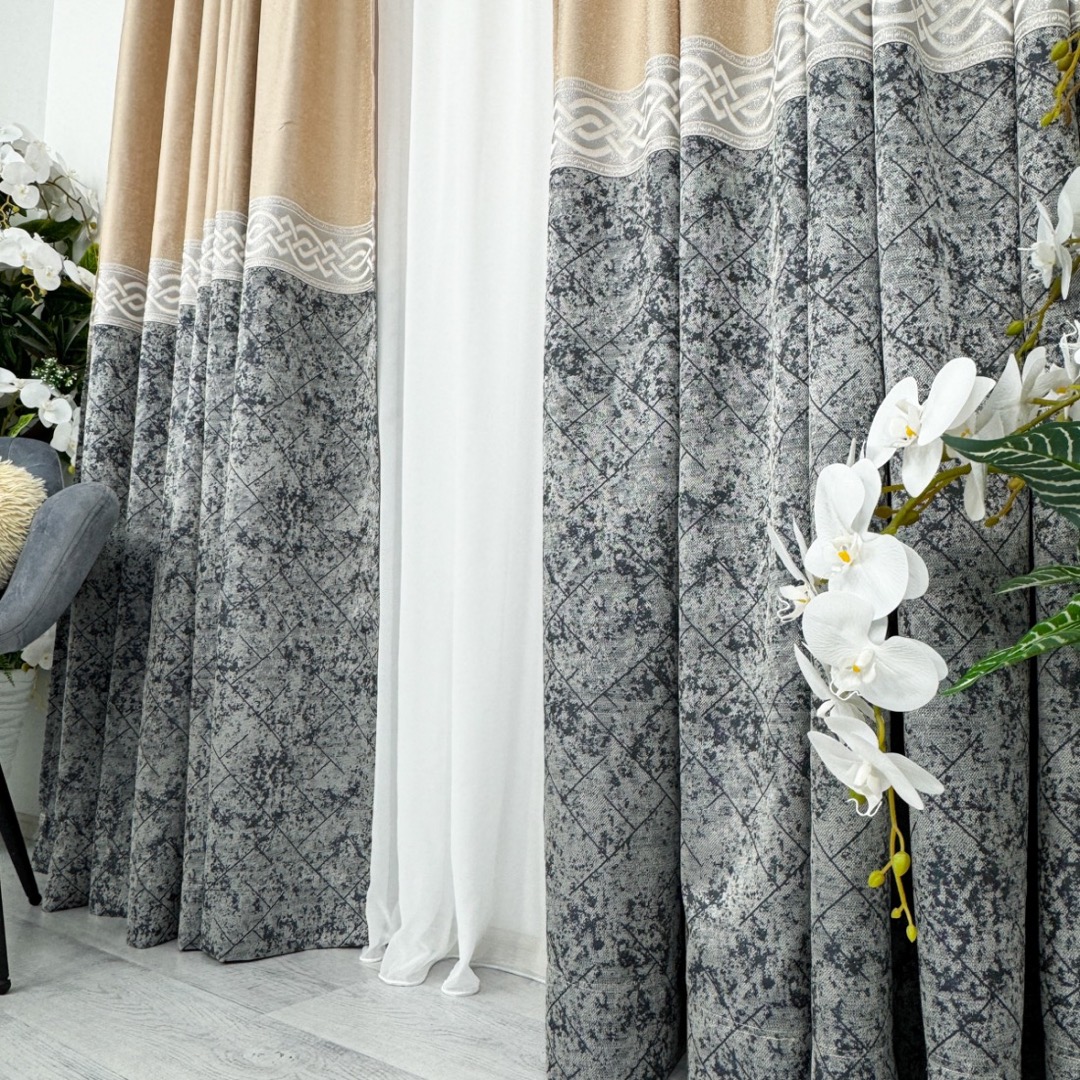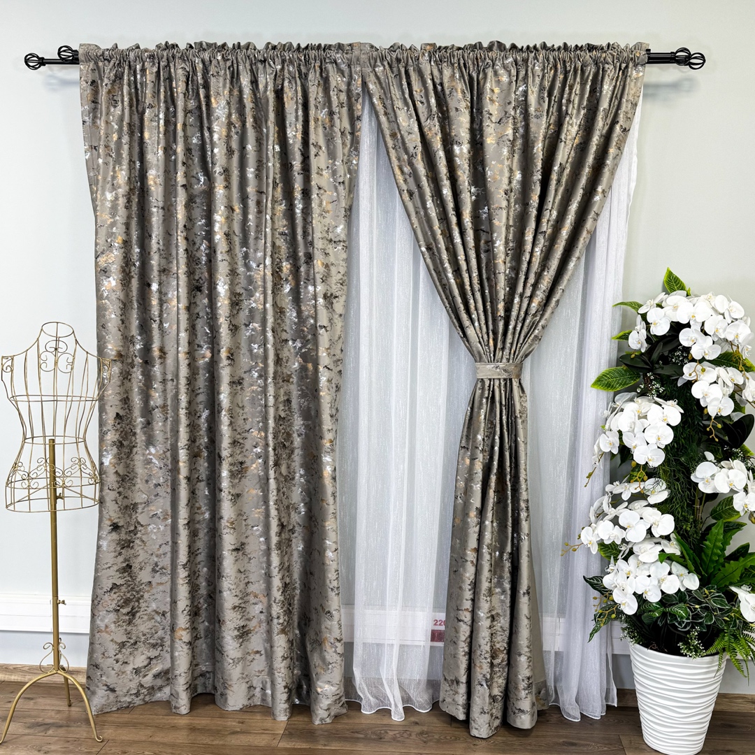 Draperiile Royal reprezinta o alegere sofisticata si luxoasa pentru orice incapere. Aceste draperii sunt confectionate dintr-un material de inalta calitate, care ofera o textura moale si bogata, aducand un sentiment de rafinament si eleganta in orice spatiu. Ceea ce face draperiile cu adevarat remarcabile sunt detaliile aurii. Aceste insertii metalizate adauga un element de stralucire si glamour, creand un contrast elegant cu textura mata a materialului. Fie ca sunt plasate intr-un li