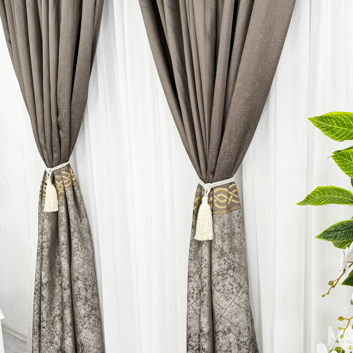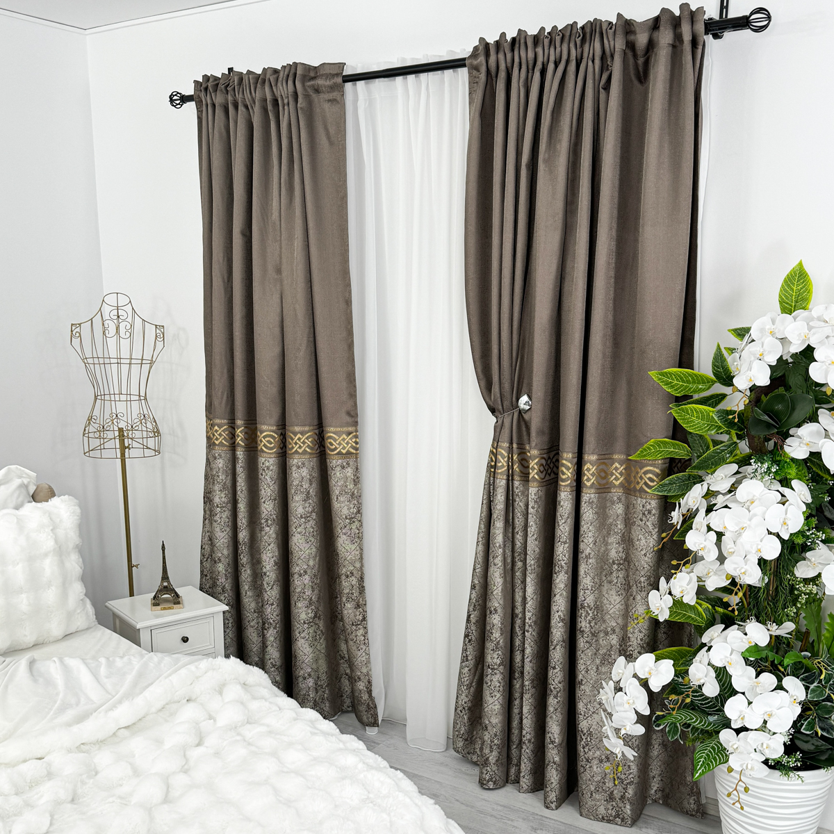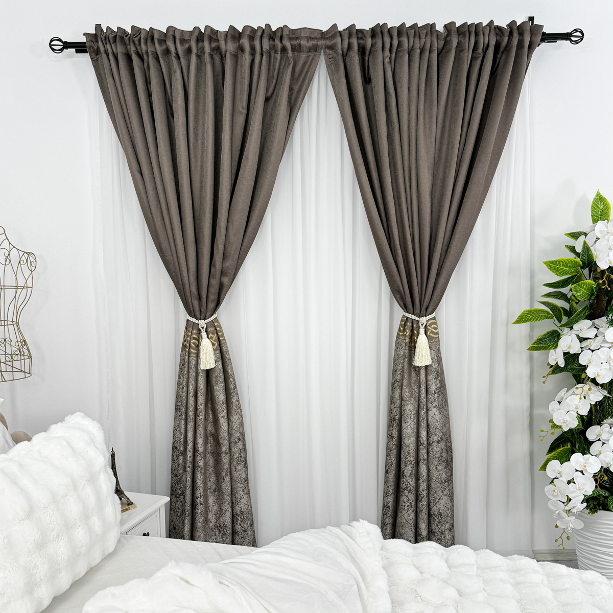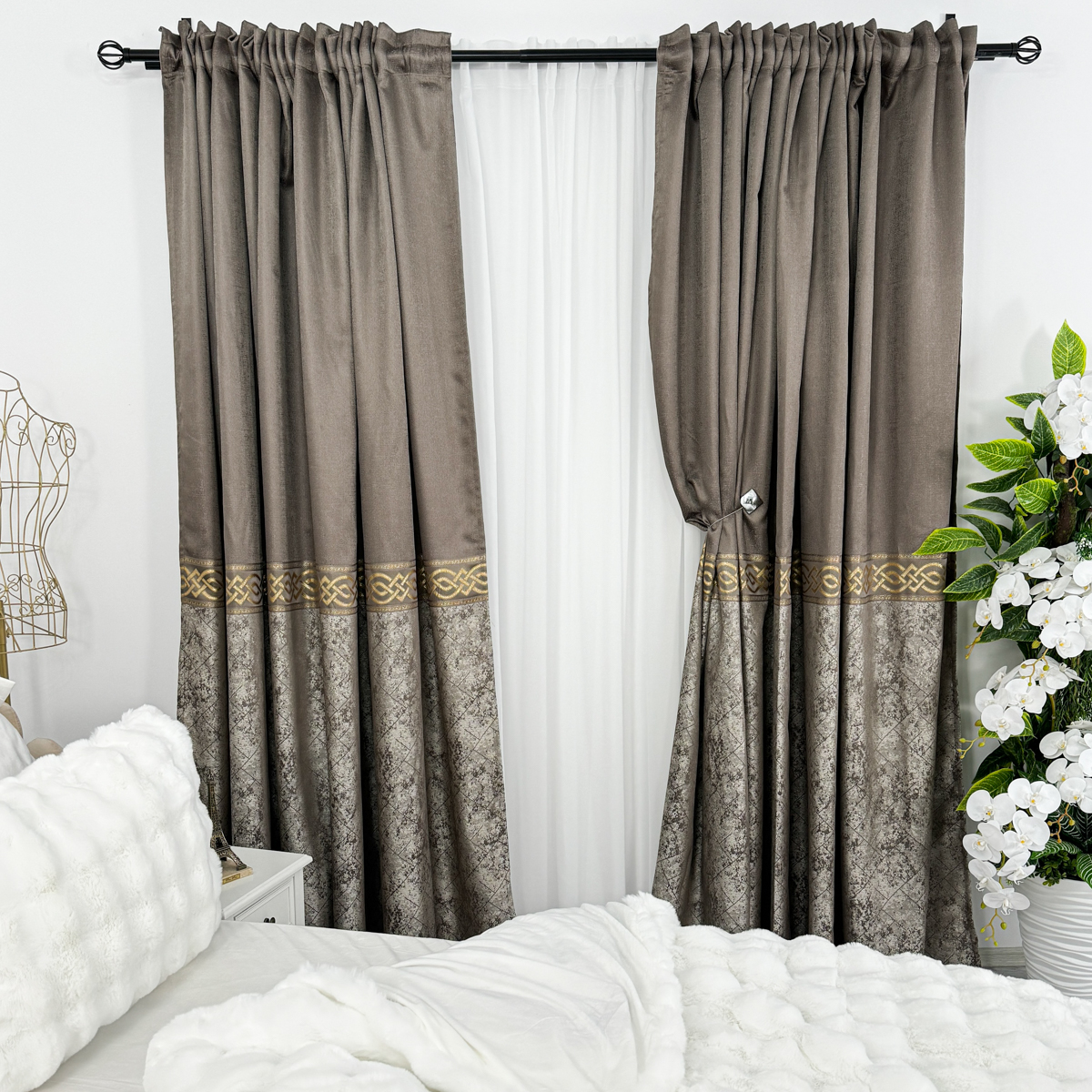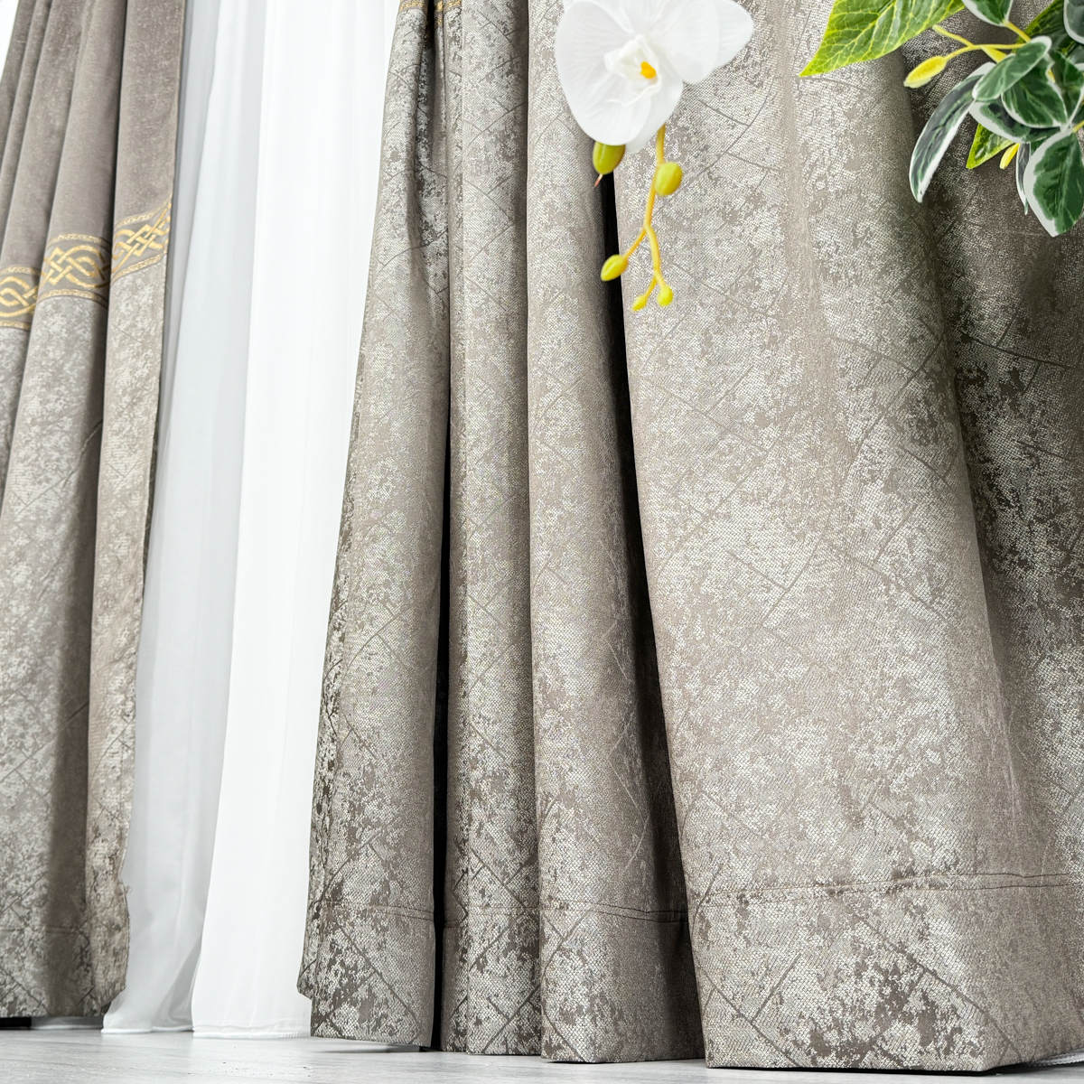 Draperiile Royal reprezinta o alegere sofisticata si luxoasa pentru orice incapere. Aceste draperii sunt confectionate dintr-un material de inalta calitate, care ofera o textura moale si bogata, aducand un sentiment de rafinament si eleganta in orice spatiu. Ceea ce face draperiile cu adevarat remarcabile sunt detaliile aurii. Aceste insertii metalizate adauga un element de stralucire si glamour, creand un contrast elegant cu textura mata a materialului. Fie ca sunt plasate intr-un li