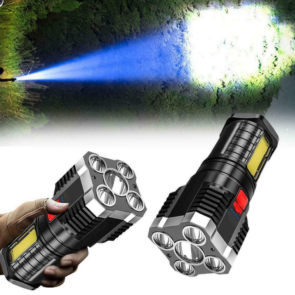 Set 2 x Lanterna de mana 5 LED + 1 LED COB lateral Super luminoasa, 1200 mAh, incarcare USB, afisaj baterie Material: ABS Dimensiune: aproximativ 6 x 6 x 15 cm Capacitate baterie: 1200 mAh Sursa de alimentare: incarcare USB Forma sursei de lumina: LED Mediu aplicabil: drumetii, camping, pescuit, etc.