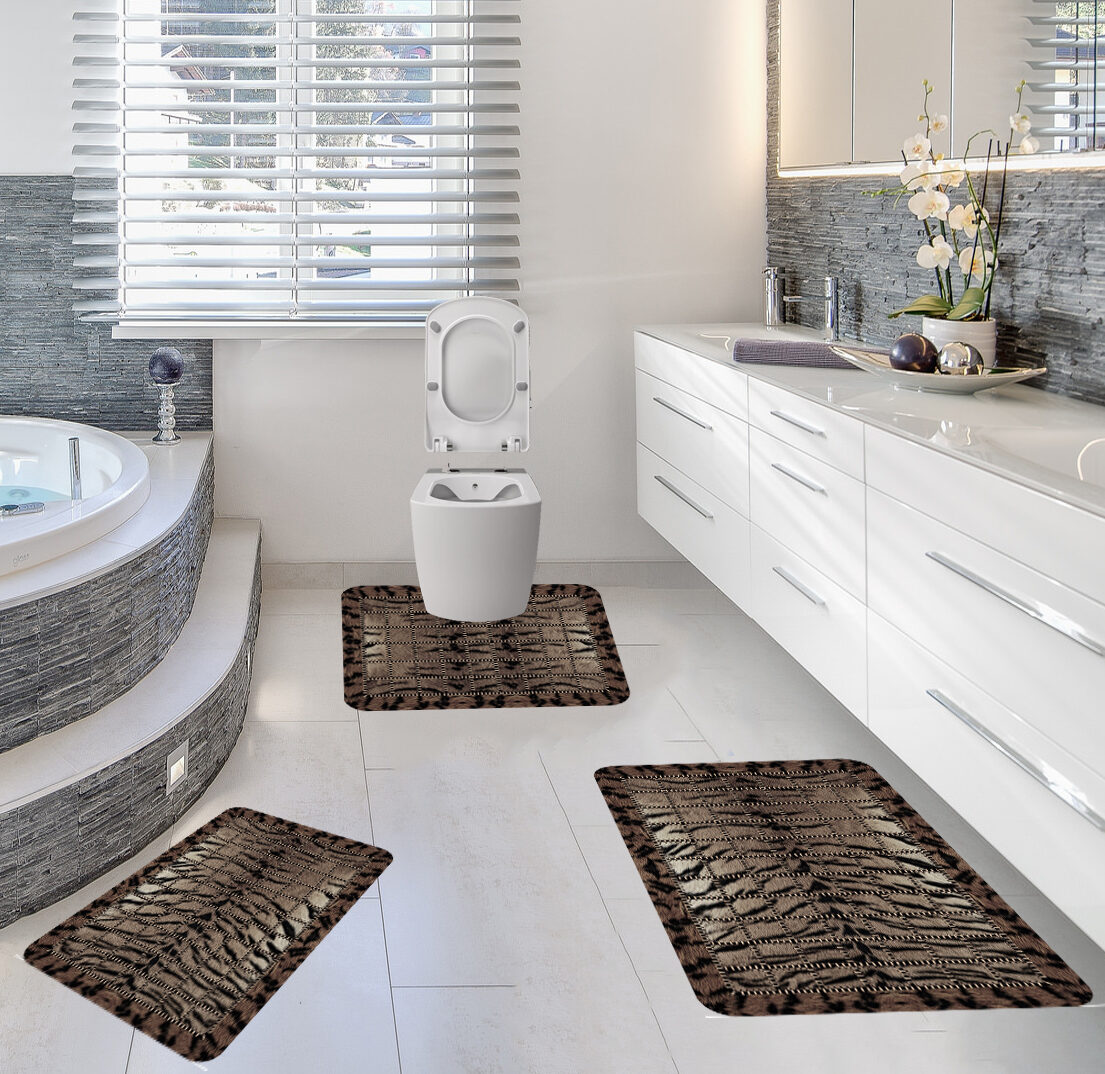 Set 3 covorase antiderapante de baie, Animal Print Setul de covoare pentru baie este antistatic, absorbant si usor de intretinut. Cu suport anti-alunecare, asigura o iesire fara riscuri din cada de baie. Covorasul pentru suportul de la chiuveta va ofera caldura si confort. Pachetul include: 1 covoras pentru baie, 100 x 60 cm 1 covoras pentru suportul de la chiuveta, 50 x 60 cm 1 covoras pentru WC, 50 x 60 cm Intretinere produs: Poate fi curat foarte usor cu aspiratorul Poate fi curatat prin stergere cu spuma unui amestec din apa cu detergent Poate fi spalat chimic la masini speciale insa fara a fi folositi inalbitori Dupa curatare covorul se lasa la uscat, dar nu se expune in lumina directa a soarelui Nu se foloseste fierul de calcat
