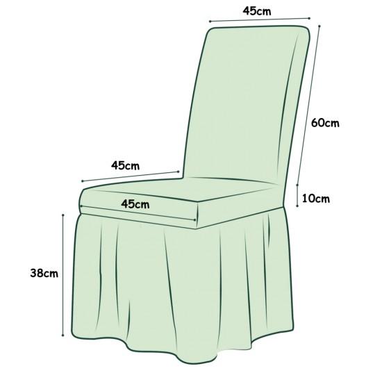 Set 6 x husa de scaun, cu volane - Crem Inaltime spatar: 45-60 cm Grosime sezut: 5-10 cm Latime sezut: 40-50 cm Lungime sezut: 40-50 cm Lungime voal: 36 cm Acum poti schimba aspectul scaunelor din living sau bucatarie, cu ajutorul huselor elastice. Astfel te asiguri ca acestea sunt protejate si totodata te vei bucura de aspectul placut pe care il va capata incaperea. Datorita materialului elastic din care sunt confectionate, husele se vor mula perfect pe scaune.