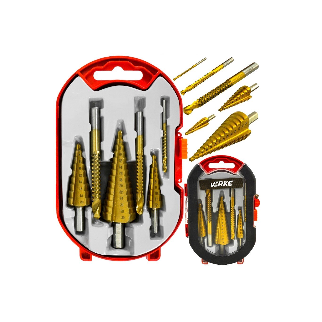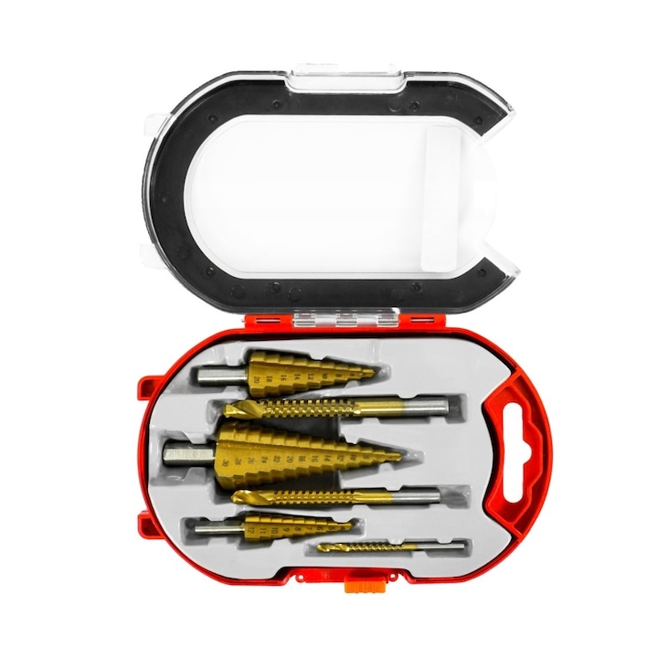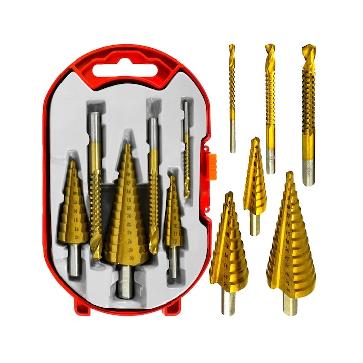Set burghie conice, 6 piese 4-12, 4-20, 4-30 mm, 3 burghie: 3, 6, 8 mm Mandrina 4-12MM 6mm Mandrina 4-20MM 8mm Mandrina 4-30MM 10mm Graduat la fiecare 2 mm si 1 mm Mandrina 3MM 3mm Mandrina 6MM 6mm Mandrina 8MM 8mm Burghie trepte spiralate de inalta calitate, fabricate din otel HSS4241 de inalta calitate. Aplicatie larga: pentru tabla, plastic, metal. Suprafata de lucru - Metal Unealta compatibila - Masina de gaurit Numar bucat - set 6
