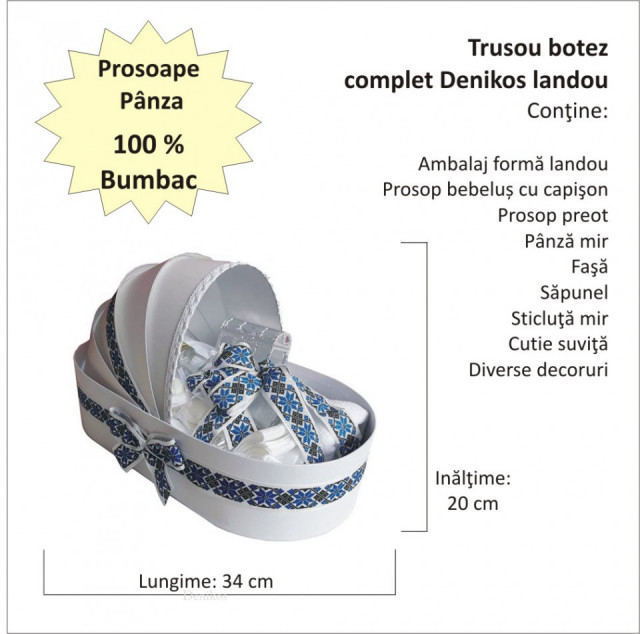 Set costum botez, trusou si lumanare personalizata, decor traditional, Denikos® C9001 DESCRIERE Pentru a ne comunica marimea costumasului si orice alte detalii legate de livrarea trusoului, te vom contacta in maxim 48 ore de la inregistrarea comenzii in sistem. Set special creat pentru ceremonia de botez. Setul este alcatuit din trusou complet ambalat intr-o cutie tip landou decorata tradional, o lumanare asortata personalizata cu numele copilului si un costum botez traditional baieti alb cu broderie traditionala realizat din materiale de cea mai buna calitate (100% bumbac). Setul contine 10 piese: - cutie de trusou in forma de landou; - prosop cu gluga pentru bebelus, dimensiuni 80 x 80 cm, 100% bumbac; - panza de mir, 100% bumbac; - prosop pentru preot, dimensiuni 30 x 50 cm, 100% bumbac; - fasa de botez, dimensiune 150 cm; - sticluta de mir, capacitate 100 ml; - sapunel; - cutiuta pentru suvita de par. - lumanare de botez (35 cm inaltime). - costum botez traditional. Costumul contine: vesta, camansa, pantalon, caciulita. Masuri disponibile costum: 3, 6, 9 luni