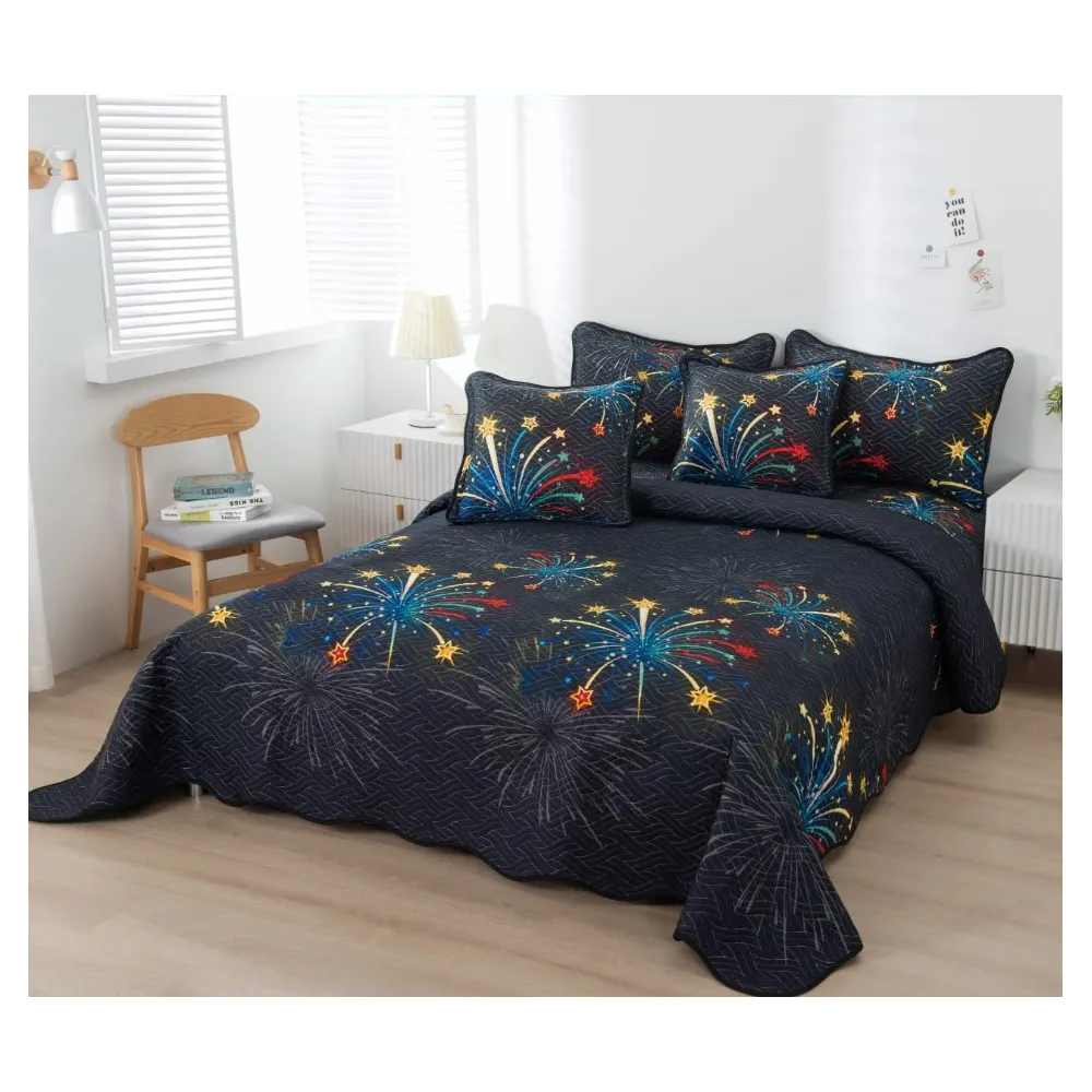 Cuvertura Pat din Bumbac este compusa din 5 piese si este realizata din bumbac 100%. Cuvertura de pat este rezistenta la spalari repetate. Pernele decorative creaza senzatia de confort si relaxare. Decoreaza dormitorul cu eleganta cuverturei de pat din bumbac. Pachetul cuverturii de pat contine 5 piese: Cuvertura 230 x 250 cm ± 5cm. 2 fete de perna 60 x 80 cm ± 5cm. 2 fete de perna 55 x 55 cm ± 5cm. Intretinere cuvertura pat: Se spala la 30°C automat; Se calca la max 120°C; Nu se folosesc inalbitori chimici. Fetele de perna sunt in functie de cum este taiat materialul.