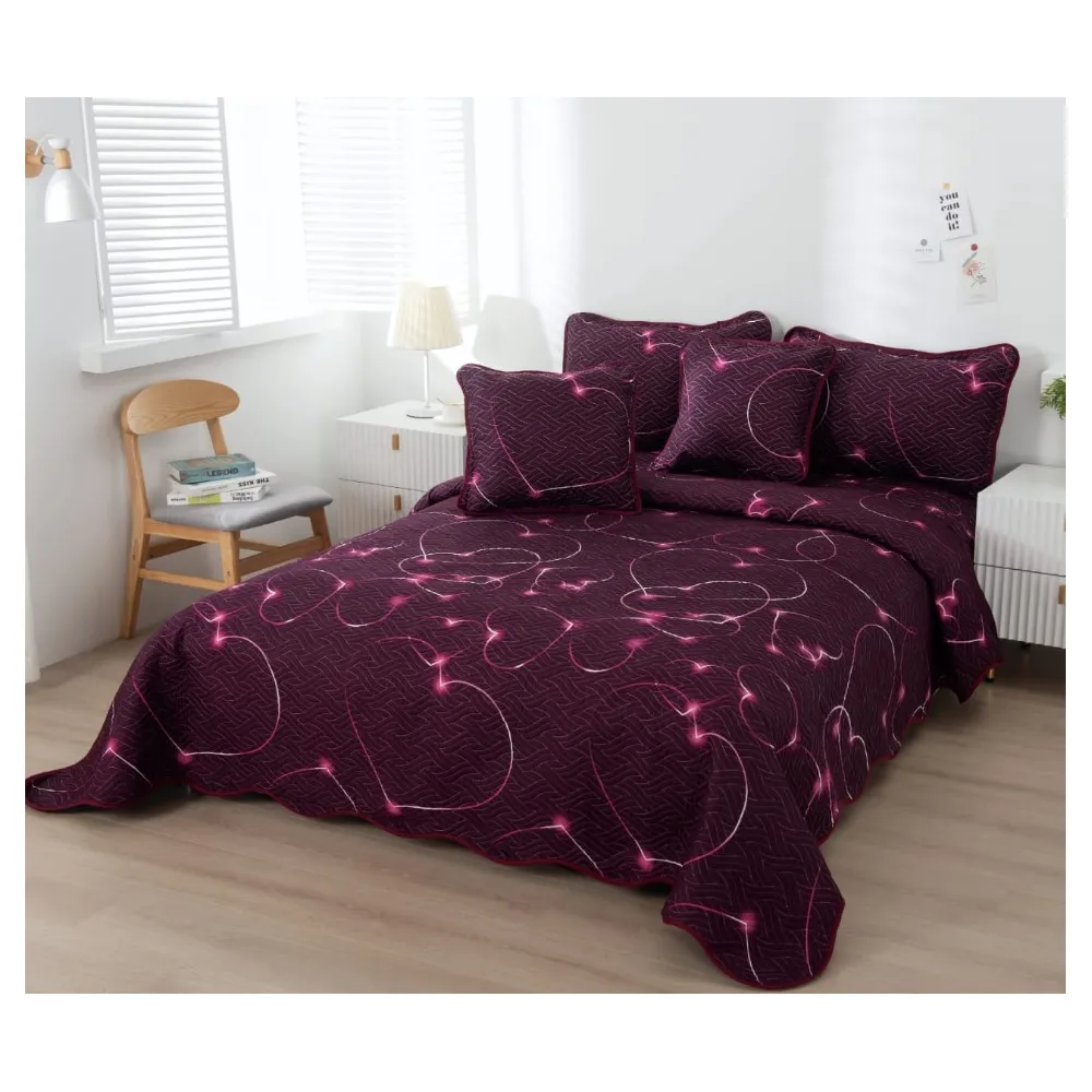 Cuvertura Pat din Bumbac este compusa din 5 piese si este realizata din bumbac 100%. Cuvertura de pat este rezistenta la spalari repetate. Pernele decorative creaza senzatia de confort si relaxare. Decoreaza dormitorul cu eleganta cuverturei de pat din bumbac. Pachetul cuverturii de pat contine 5 piese: Cuvertura 230 x 250 cm ± 5cm. 2 fete de perna 60 x 80 cm ± 5cm. 2 fete de perna 55 x 55 cm ± 5cm. Intretinere cuvertura pat: Se spala la 30°C automat; Se calca la max 120°C; Nu se folosesc inalbitori chimici. Fetele de perna sunt in functie de cum este taiat materialul.