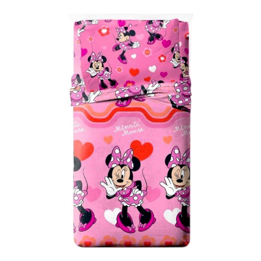 Set lenjerie pat, 4 piese, husa saltea 160x200 cm, cearceaf pat 240x280 cm, 2 fete perna 50x70 cm, multicolor, Minnie Mouse Setul de lenjerie de pat cu 4 piese, cu design Minnie Mouse, este alegerea potrivita pentru camera copiilor care adora universul Disney. Cu un model multicolor, jucaus si plin de farmec, acest set aduce un plus de culoare si stil in orice dormitor. Setul contine o husa de saltea 160x200 cm, un cearceaf de pat 240x280 cm si doua fete de perna 50x70 cm, toate fabricate din materiale delicate, confortabile si usor de intretinut. Imprimeul plin de viata si detaliile atent realizate creeaza o atmosfera deosebita si prietenoasa in spatiul de odihna.