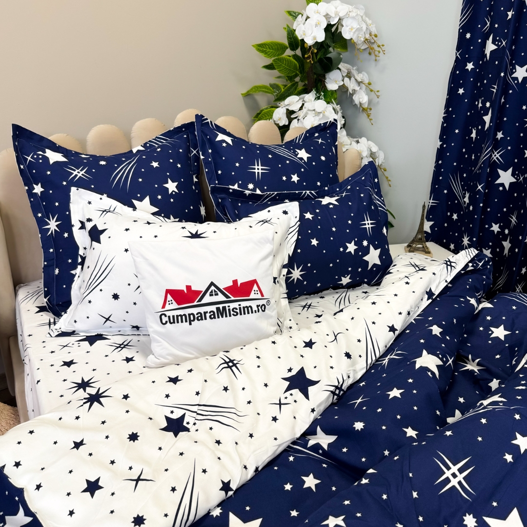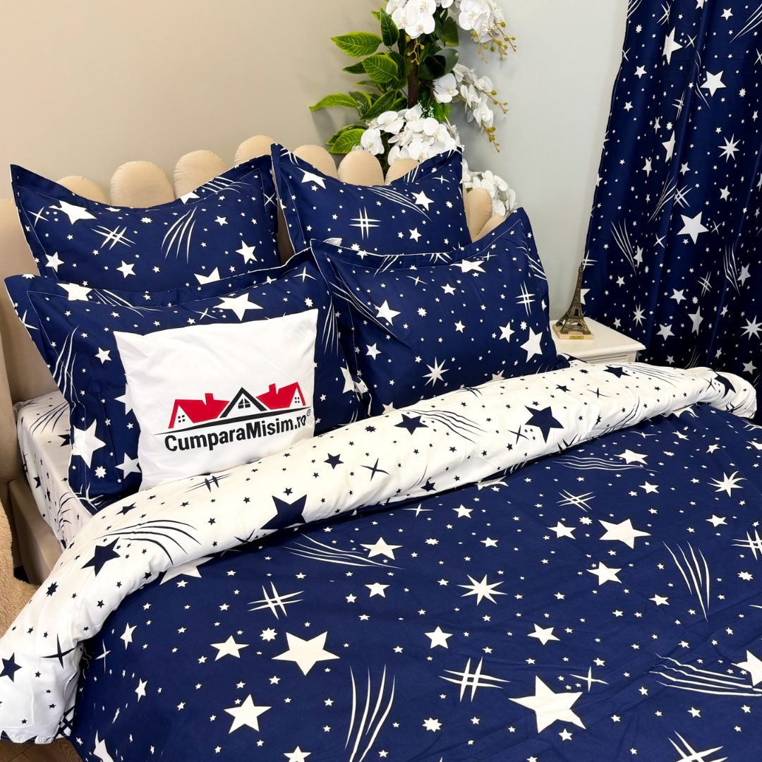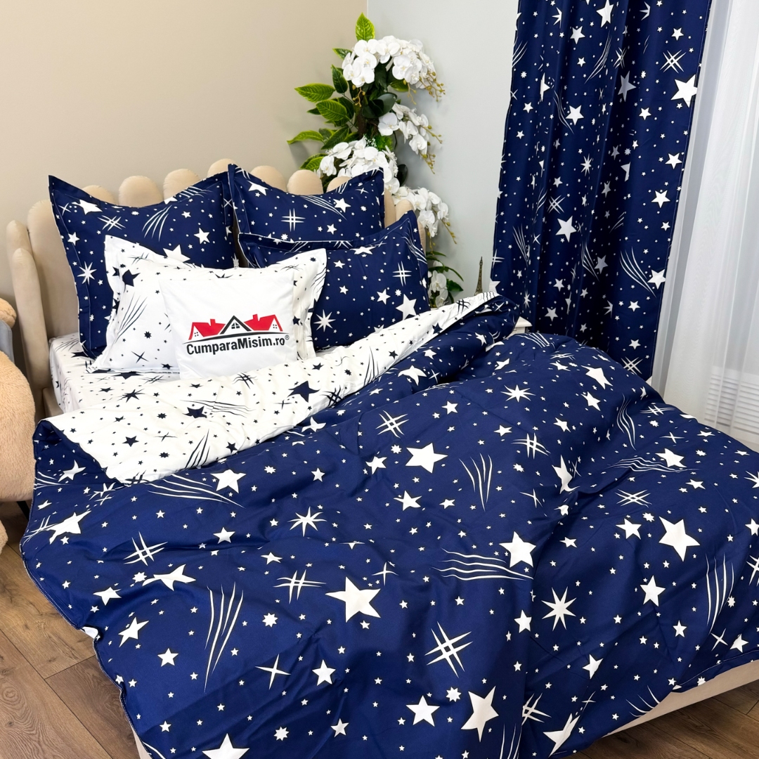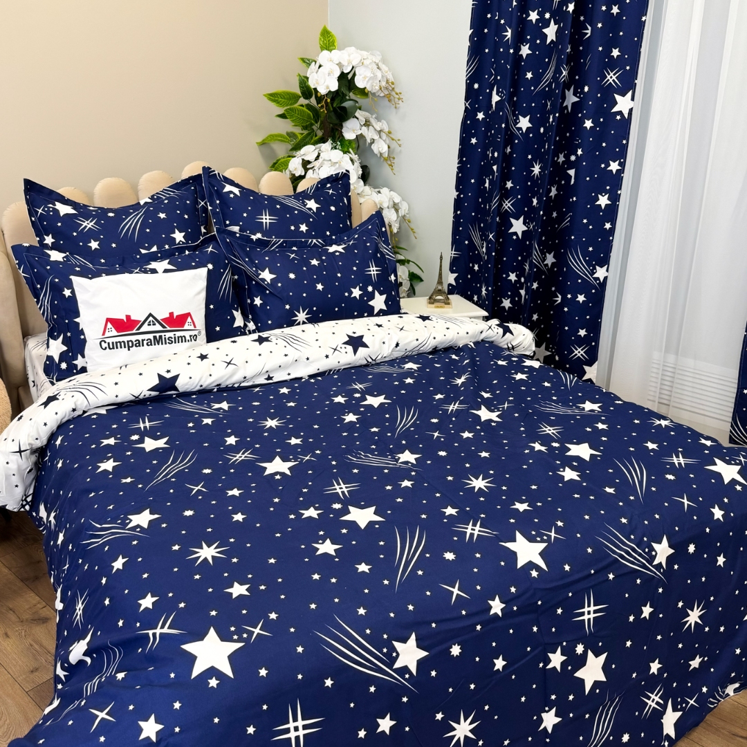 Set Lenjerie pat dublu (140x200cm, 160x200cm, 180x200cm) + 2 draperii, finet, 8 piese, Albastru, Alb, ploaie de stele