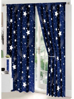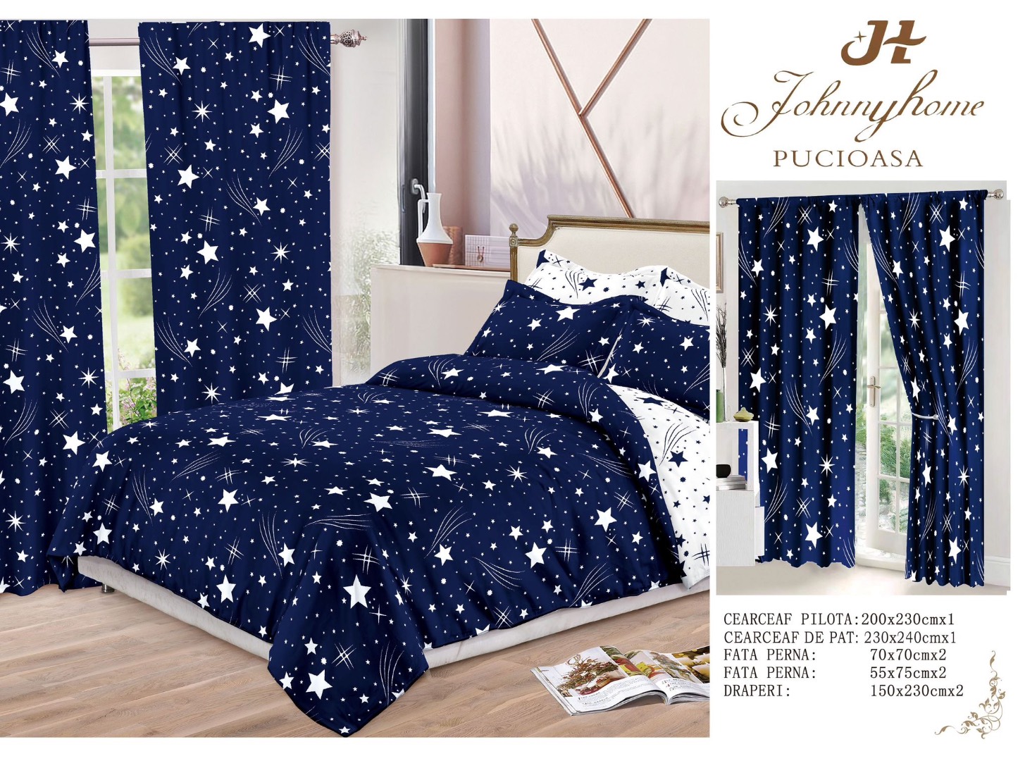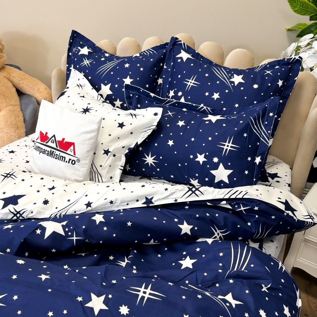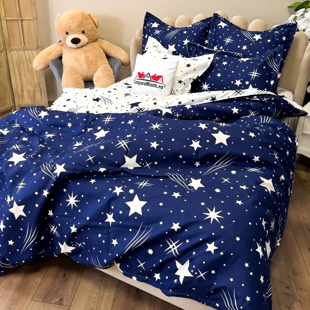 Set Lenjerie pat dublu (140x200cm, 160x200cm, 180x200cm) + 2 draperii, finet, 8 piese, Albastru, Alb, ploaie de stele