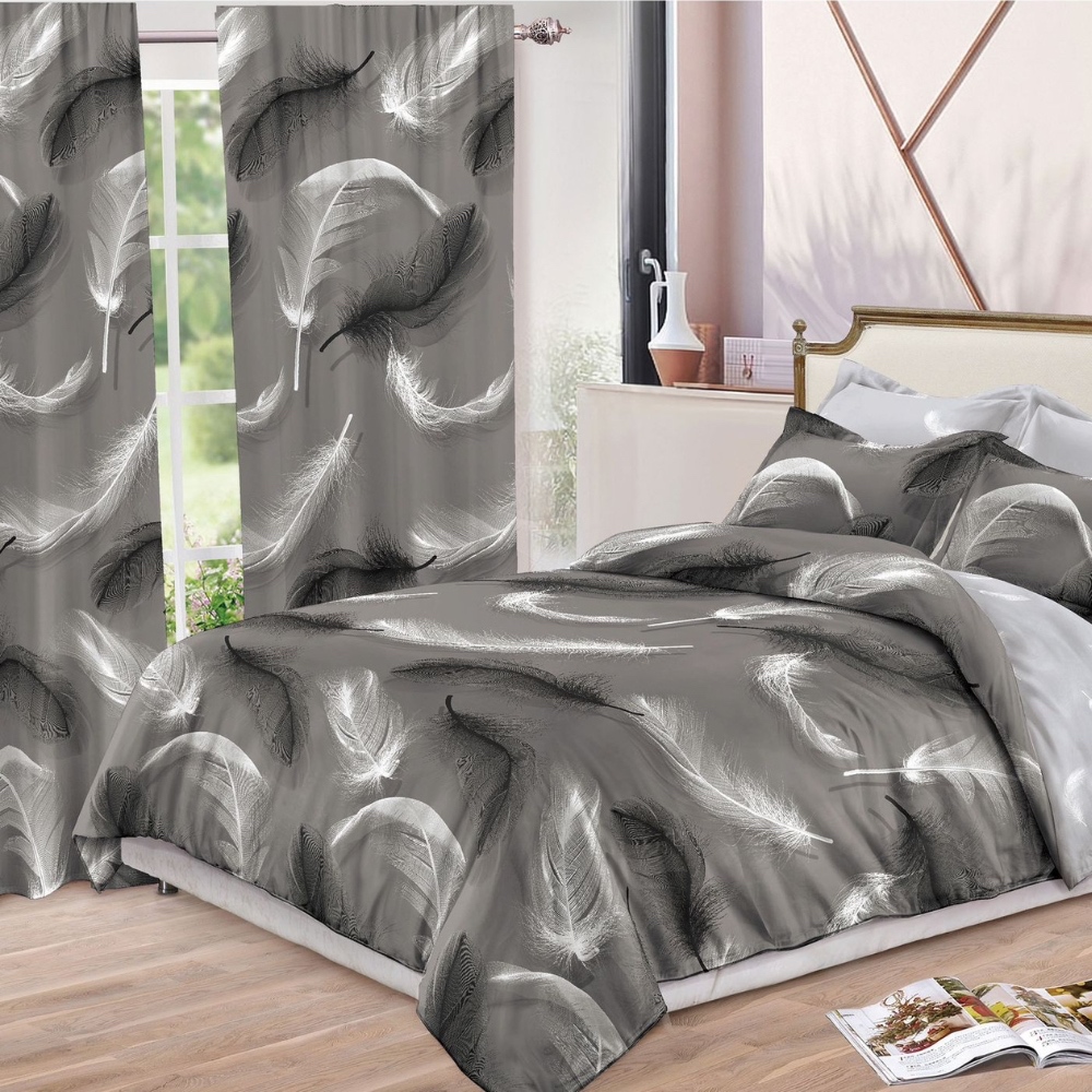 Set Lenjerie pat dublu (140x200cm, 160x200cm, 180x200cm) + 2 draperii, finet, 8 piese, Gri, Alb, pene