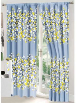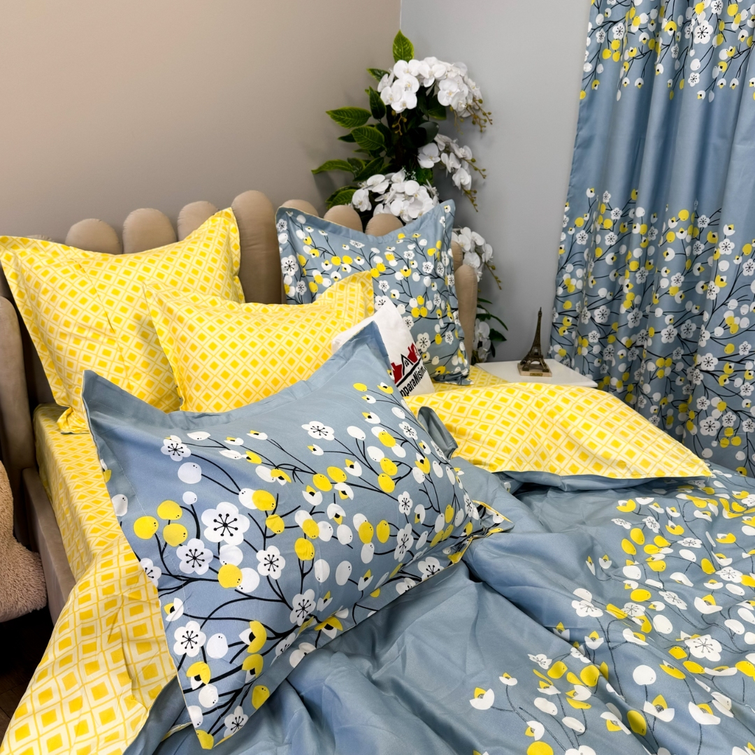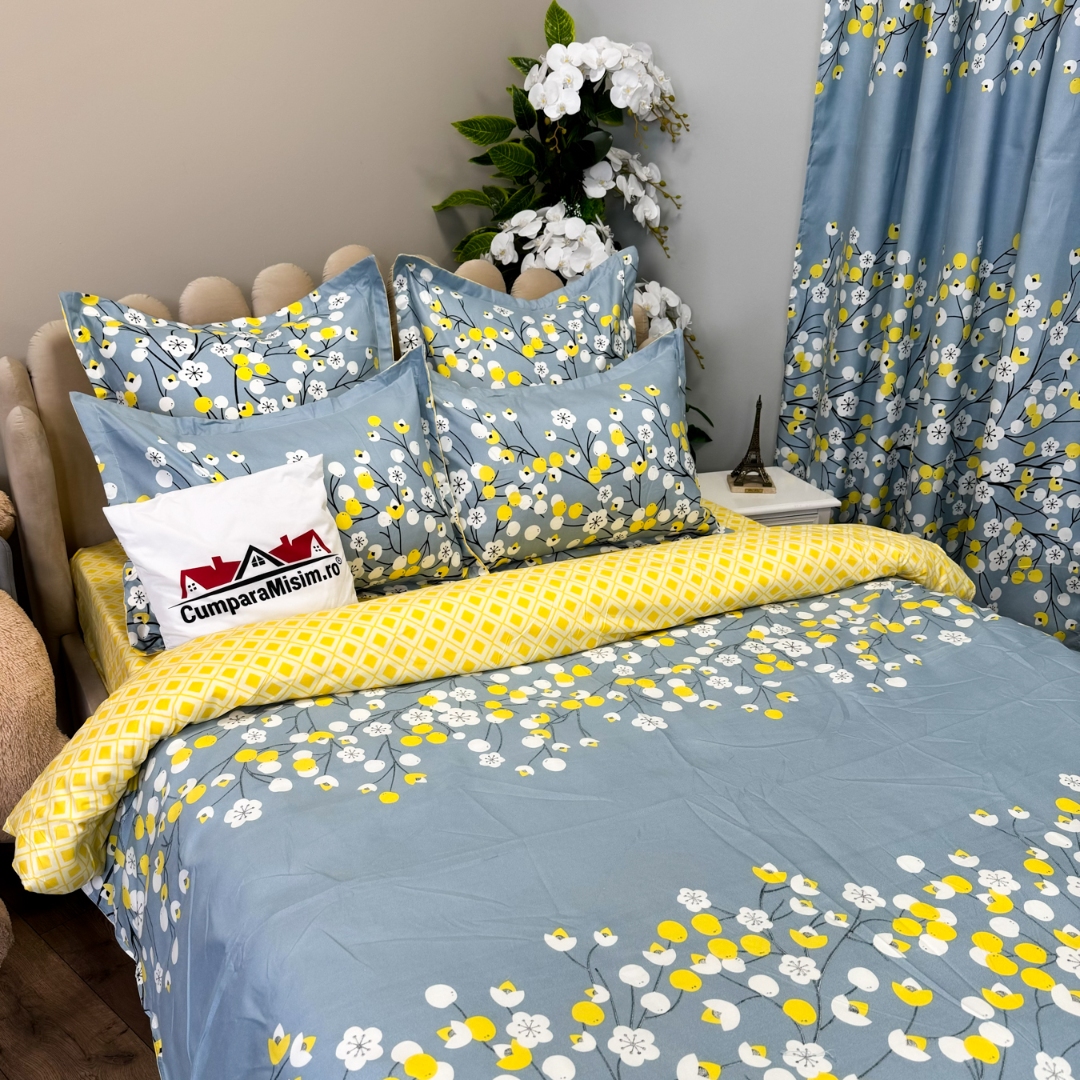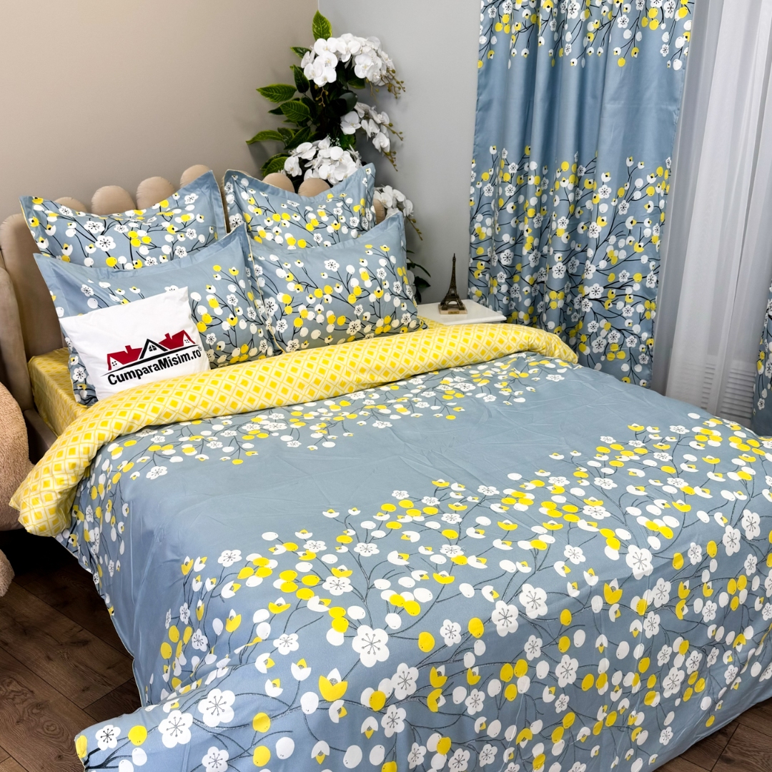 Set Lenjerie pat dublu (140x200cm, 160x200cm, 180x200cm) + 2 draperii, finet, 8 piese, Gri albastrui, flori